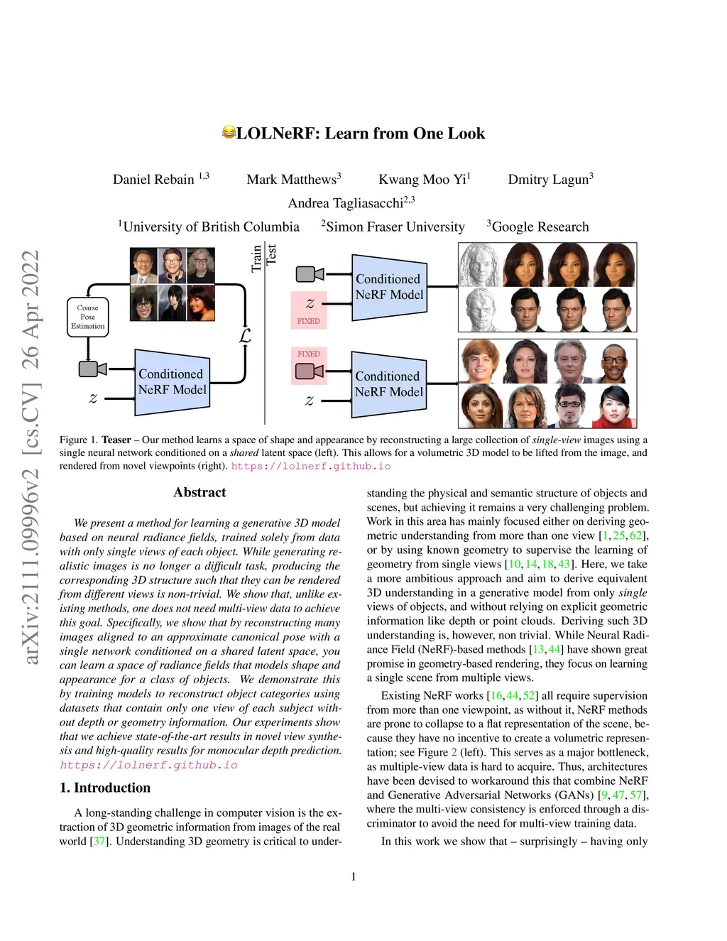 We present a method for learning a generative 3D model based on neural radiance fields, trained solely from data with only single views of each object. While generating realistic images is no longer a difficult task, producing the corresponding 3D structure such that they can be rendered from different views is non-trivial. We show that, unlike existing methods, one does not need multi-view data to achieve this goal. Specifically, we show that by reconstructing many images aligned to an approximate canonical pose with a single network conditioned on a shared latent space, you can learn a space of radiance fields that models shape and appearance for a class of objects. We demonstrate this by training models to reconstruct object categories using datasets that contain only one view of each subject without depth or geometry information. Our experiments show that we achieve state-of-the-art results in novel view synthesis and high-quality results for monocular depth prediction.
