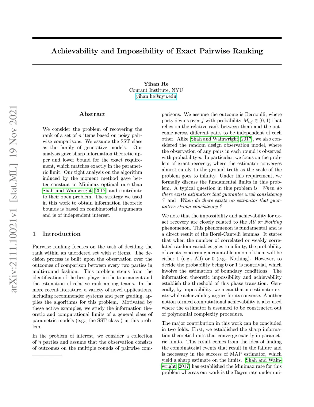 We consider the problem of recovering the rank of a set of items based on noisy pairwise comparisons. We assume the SST class as the family of generative models. Our analysis gave sharp information theoretic upper and lower bound for the exact requirement, which matches exactly in the parametric limit. Our tight analysis on the algorithm induced by the moment method gave better constant in Minimax optimal rate than ~\citet{shah2017simple} and contribute to their open problem. The strategy we used in this work to obtain information theoretic bounds is based on combinatorial arguments and is of independent interest.