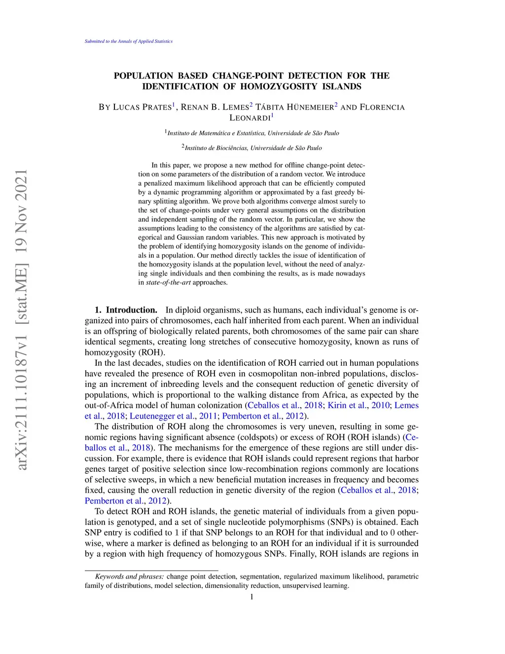 In this paper, we propose a new method for offline change-point detection on some parameters of the distribution of a random vector. We introduce a penalized maximum likelihood approach that can be efficiently computed by a dynamic programming algorithm or approximated by a fast greedy binary splitting algorithm. We prove both algorithms converge almost surely to the set of change-points under very general assumptions on the distribution and independent sampling of the random vector. In particular, we show the assumptions leading to the consistency of the algorithms are satisfied by categorical and Gaussian random variables. This new approach is motivated by the problem of identifying homozygosity islands on the genome of individuals in a population. Our method directly tackles the issue of identification of the homozygosity islands at the population level, without the need of analyzing single individuals and then combining the results, as is made nowadays in state-of-the-art approaches.