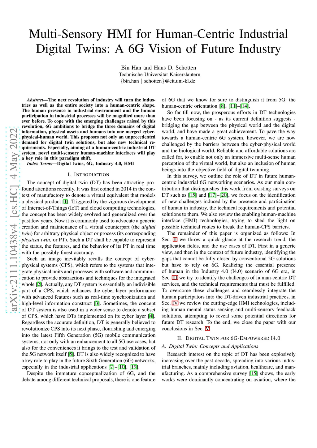 The next revolution of industry will turn the industries as well as the entire society into a human-centric shape. The human presence in industrial environment and the human participation in industrial processes will be magnified more than ever before. To cope with the emerging challenges raised by this revolution, 6G ambitions to bridge the three domains of digital information, physical assets and humans into one merged cyberphysical-human world. This proposes not only an unprecedented demand for digital twin solutions, but also new technical requirements. Especially, aiming at a human-centric industrial DT system, novel multi-sensory human-machine interfaces will play a key role in this paradigm shift.
