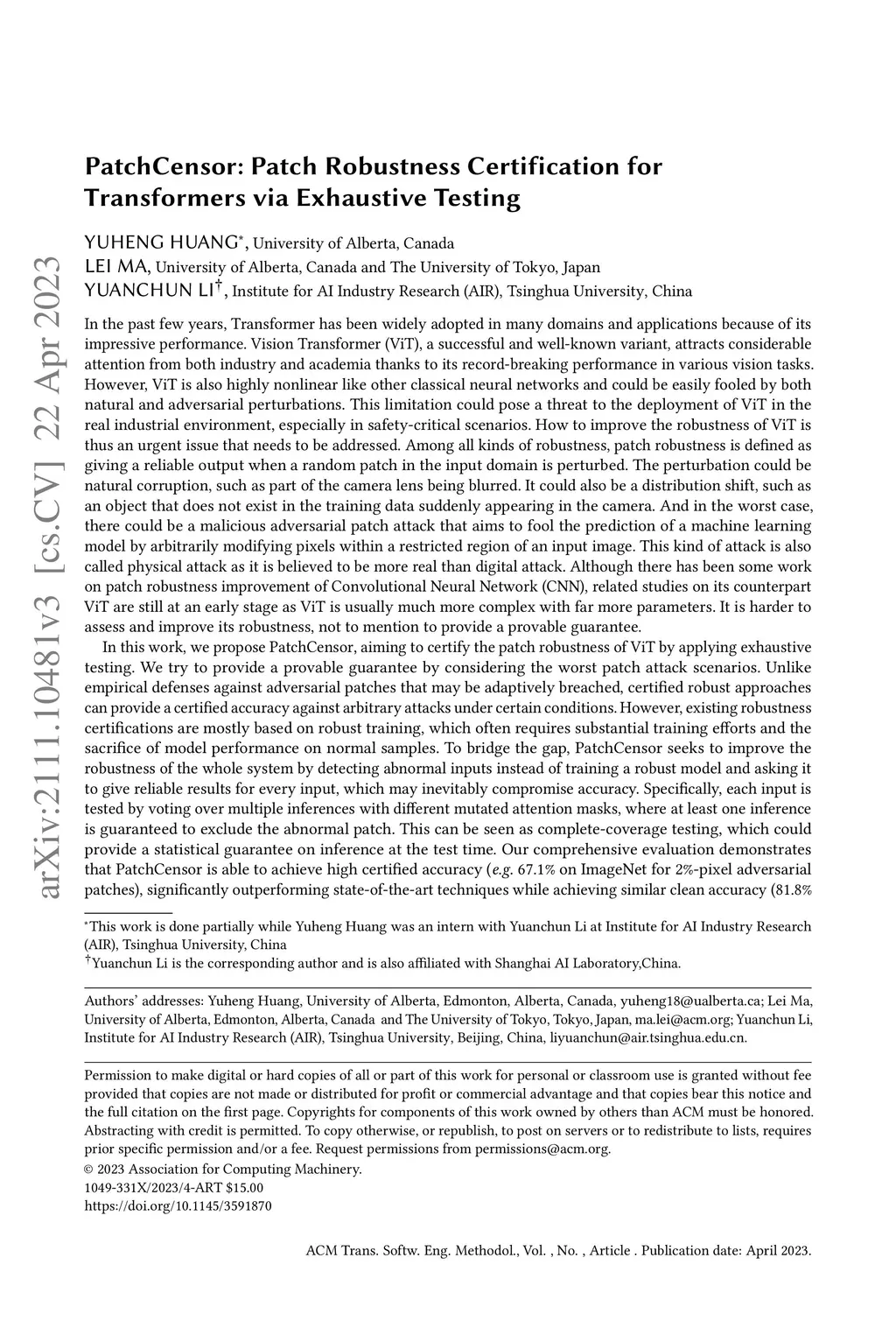 PatchCensor: Patch Robustness Certification for Transformers via