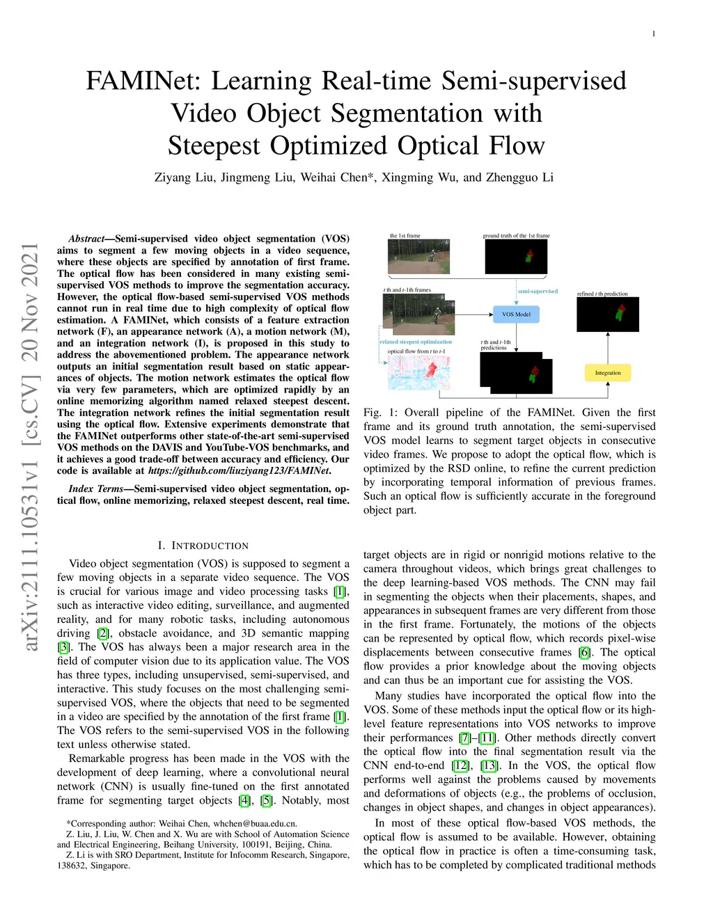 Semi-supervised video object segmentation (VOS) aims to segment a few moving objects in a video sequence, where these objects are specified by annotation of first frame. The optical flow has been considered in many existing semi-supervised VOS methods to improve the segmentation accuracy. However, the optical flow-based semi-supervised VOS methods cannot run in real time due to high complexity of optical flow estimation. A FAMINet, which consists of a feature extraction network (F), an appearance network (A), a motion network (M), and an integration network (I), is proposed in this study to address the abovementioned problem. The appearance network outputs an initial segmentation result based on static appearances of objects. The motion network estimates the optical flow via very few parameters, which are optimized rapidly by an online memorizing algorithm named relaxed steepest descent. The integration network refines the initial segmentation result using the optical flow. Extensive experiments demonstrate that the FAMINet outperforms other state-of-the-art semi-supervised VOS methods on the DAVIS and YouTube-VOS benchmarks, and it achieves a good trade-off between accuracy and efficiency. Our code is available at https://github.com/liuziyang123/FAMINet.