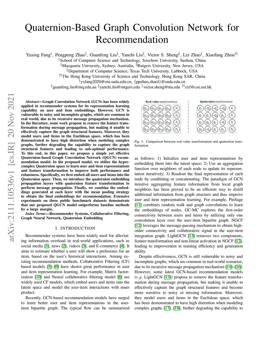 Graph Convolution Network (GCN) has been widely applied in recommender systems for its representation learning capability on user and item embeddings. However, GCN is vulnerable to noisy and incomplete graphs, which are common in real world, due to its recursive message propagation mechanism. In the literature, some work propose to remove the feature transformation during message propagation, but making it unable to effectively capture the graph structural features. Moreover, they model users and items in the Euclidean space, which has been demonstrated to have high distortion when modeling complex graphs, further degrading the capability to capture the graph structural features and leading to sub-optimal performance. To this end, in this paper, we propose a simple yet effective Quaternion-based Graph Convolution Network (QGCN) recommendation model. In the proposed model, we utilize the hyper-complex Quaternion space to learn user and item representations and feature transformation to improve both performance and robustness. Specifically, we first embed all users and items into the Quaternion space. Then, we introduce the quaternion embedding propagation layers with quaternion feature transformation to perform message propagation. Finally, we combine the embeddings generated at each layer with the mean pooling strategy to obtain the final embeddings for recommendation. Extensive experiments on three public benchmark datasets demonstrate that our proposed QGCN model outperforms baseline methods by a large margin.