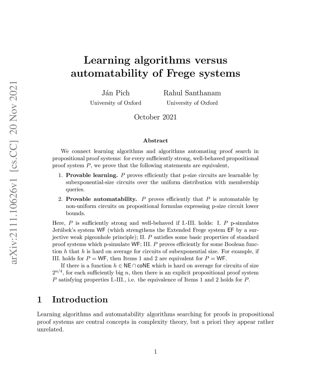 We connect learning algorithms and algorithms automating proof search in propositional proof systems: for every sufficiently strong, well-behaved propositional proof system , we prove that the following statements are equivalent, 1. Provable learning: proves efficiently that p-size circuits are learnable by subexponential-size circuits over the uniform distribution with membership queries. 2. Provable automatability: proves efficiently that is automatable by non-uniform circuits on propositional formulas expressing p-size circuit lower bounds. Here, is sufficiently strong and well-behaved if I.-III. holds: I. p-simulates Je\v{r}\ábek's system (which strengthens the Extended Frege system by a surjective weak pigeonhole principle); II. satisfies some basic properties of standard proof systems which p-simulate ; III. proves efficiently for some Boolean function that is hard on average for circuits of subexponential size. For example, if III. holds for , then Items 1 and 2 are equivalent for . If there is a function which is hard on average for circuits of size , for each sufficiently big , then there is an explicit propositional proof system satisfying properties I.-III., i.e. the equivalence of Items 1 and 2 holds for .