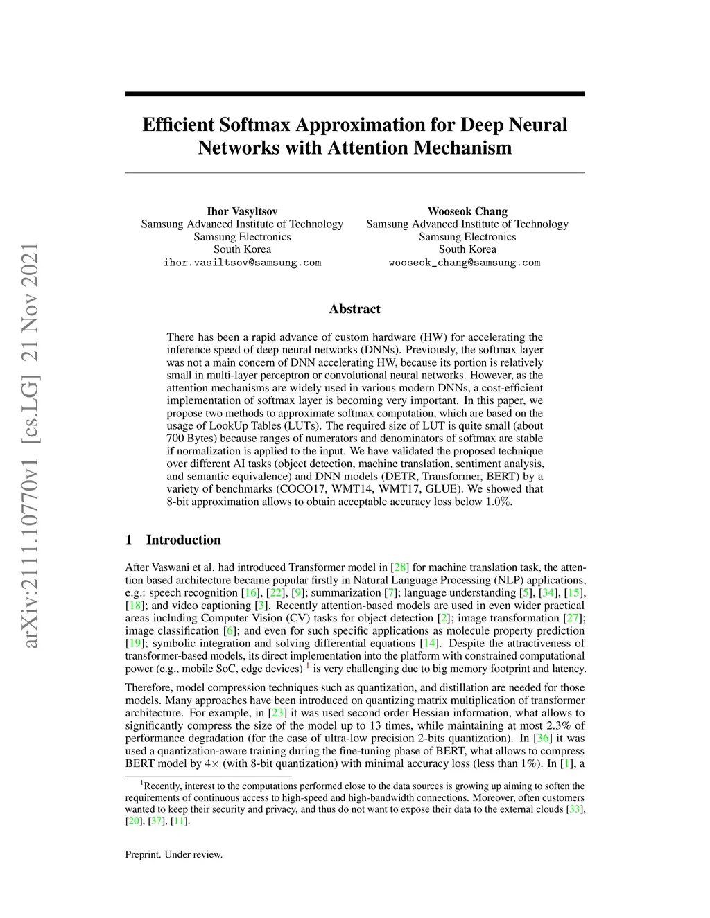 There has been a rapid advance of custom hardware (HW) for accelerating the inference speed of deep neural networks (DNNs). Previously, the softmax layer was not a main concern of DNN accelerating HW, because its portion is relatively small in multi-layer perceptron or convolutional neural networks. However, as the attention mechanisms are widely used in various modern DNNs, a cost-efficient implementation of softmax layer is becoming very important. In this paper, we propose two methods to approximate softmax computation, which are based on the usage of LookUp Tables (LUTs). The required size of LUT is quite small (about 700 Bytes) because ranges of numerators and denominators of softmax are stable if normalization is applied to the input. We have validated the proposed technique over different AI tasks (object detection, machine translation, sentiment analysis, and semantic equivalence) and DNN models (DETR, Transformer, BERT) by a variety of benchmarks (COCO17, WMT14, WMT17, GLUE). We showed that 8-bit approximation allows to obtain acceptable accuracy loss below .
