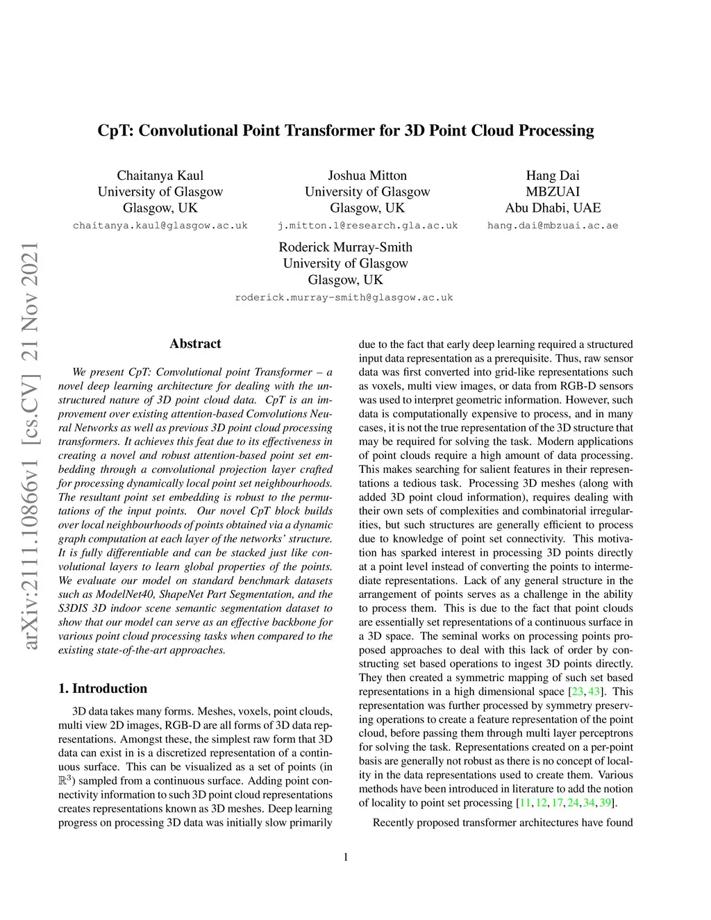 CpT: Convolutional Point Transformer for 3D Point Cloud Processing