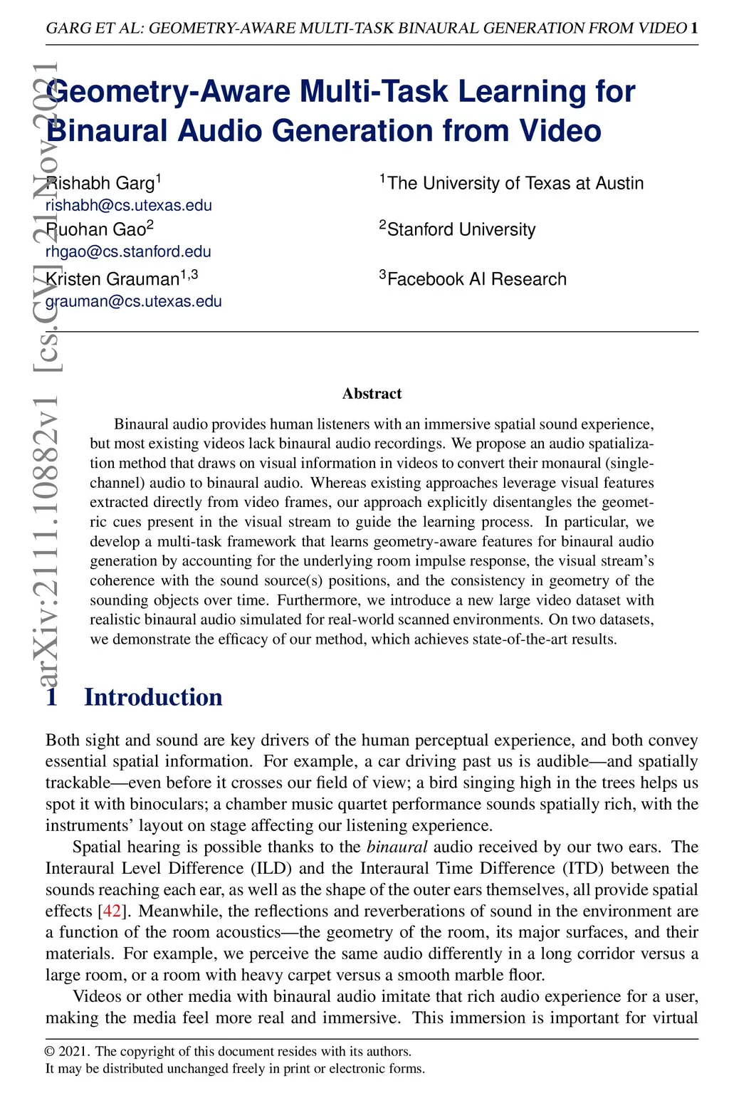 Binaural audio provides human listeners with an immersive spatial sound experience, but most existing videos lack binaural audio recordings. We propose an audio spatialization method that draws on visual information in videos to convert their monaural (single-channel) audio to binaural audio. Whereas existing approaches leverage visual features extracted directly from video frames, our approach explicitly disentangles the geometric cues present in the visual stream to guide the learning process. In particular, we develop a multi-task framework that learns geometry-aware features for binaural audio generation by accounting for the underlying room impulse response, the visual stream's coherence with the sound source(s) positions, and the consistency in geometry of the sounding objects over time. Furthermore, we introduce a new large video dataset with realistic binaural audio simulated for real-world scanned environments. On two datasets, we demonstrate the efficacy of our method, which achieves state-of-the-art results.