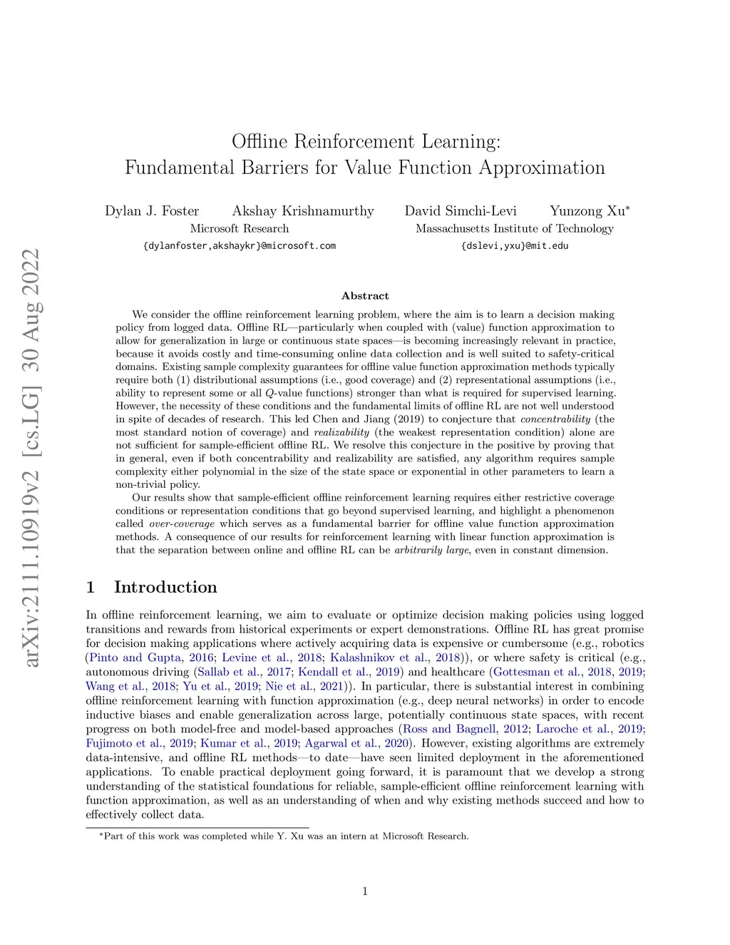 We consider the offline reinforcement learning problem, where the aim is to learn a decision making policy from logged data. Offline RL -- particularly when coupled with (value) function approximation to allow for generalization in large or continuous state spaces -- is becoming increasingly relevant in practice, because it avoids costly and time-consuming online data collection and is well suited to safety-critical domains. Existing sample complexity guarantees for offline value function approximation methods typically require both (1) distributional assumptions (i.e., good coverage) and (2) representational assumptions (i.e., ability to represent some or all -value functions) stronger than what is required for supervised learning. However, the necessity of these conditions and the fundamental limits of offline RL are not well understood in spite of decades of research. This led Chen and Jiang (2019) to conjecture that concentrability (the most standard notion of coverage) and realizability (the weakest representation condition) alone are not sufficient for sample-efficient offline RL. We resolve this conjecture in the positive by proving that in general, even if both concentrability and realizability are satisfied, any algorithm requires sample complexity polynomial in the size of the state space to learn a non-trivial policy. Our results show that sample-efficient offline reinforcement learning requires either restrictive coverage conditions or representation conditions that go beyond supervised learning, and highlight a phenomenon called over-coverage which serves as a fundamental barrier for offline value function approximation methods. A consequence of our results for reinforcement learning with linear function approximation is that the separation between online and offline RL can be arbitrarily large, even in constant dimension.