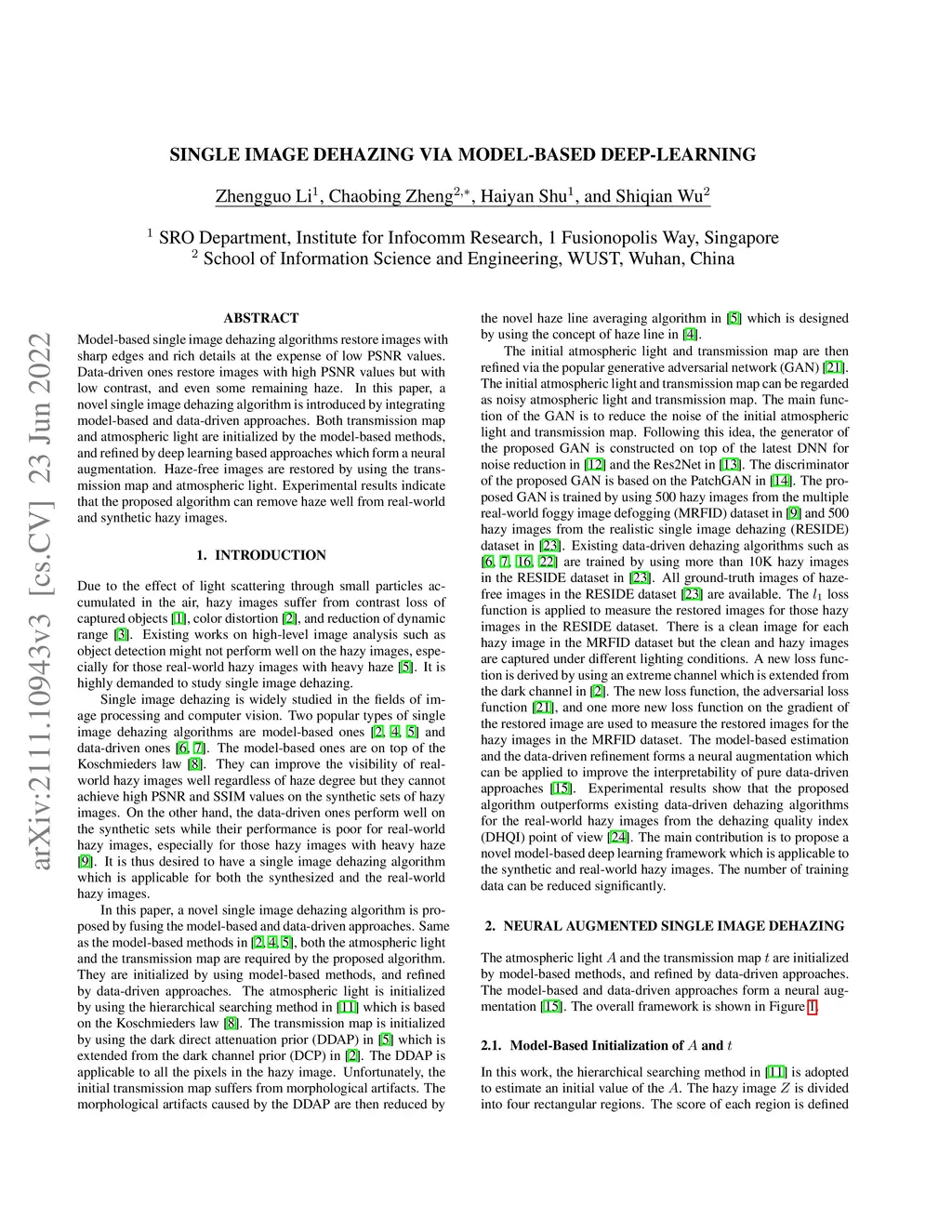 Model-based single image dehazing algorithms restore images with sharp edges and rich details at the expense of low PSNR values. Data-driven ones restore images with high PSNR values but with low contrast, and even some remaining haze. In this paper, a novel single image dehazing algorithm is introduced by fusing model-based and data-driven approaches. Both transmission map and atmospheric light are initialized by the model-based methods, and refined by deep learning approaches which form a neural augmentation. Haze-free images are restored by using the transmission map and atmospheric light. Experimental results indicate that the proposed algorithm can remove haze well from real-world and synthetic hazy images.