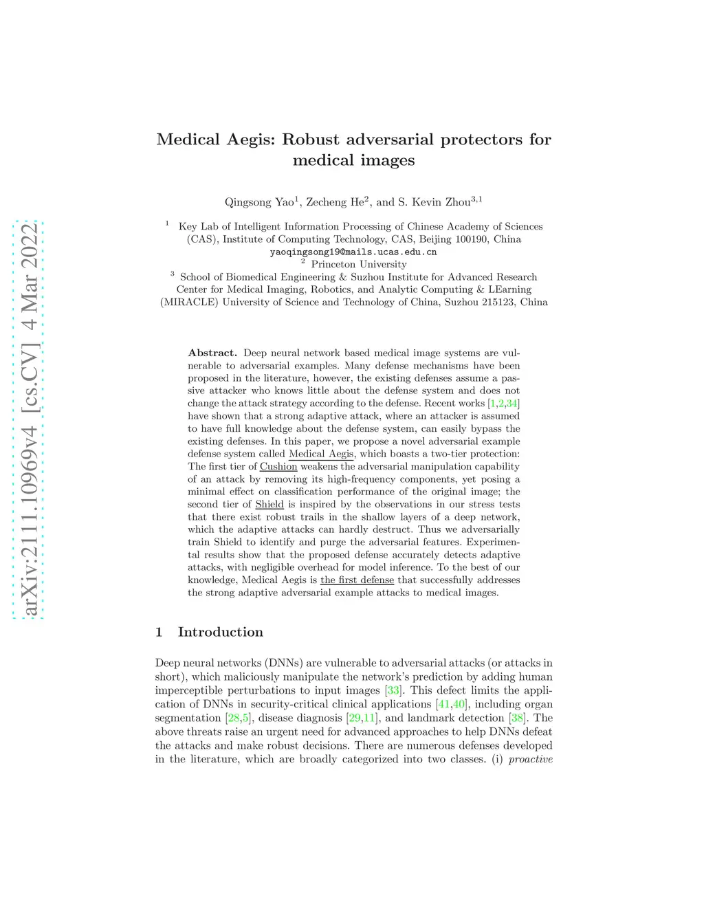 Deep neural network based medical image systems are vulnerable to adversarial examples. Many defense mechanisms have been proposed in the literature, however, the existing defenses assume a passive attacker who knows little about the defense system and does not change the attack strategy according to the defense. Recent works have shown that a strong adaptive attack, where an attacker is assumed to have full knowledge about the defense system, can easily bypass the existing defenses. In this paper, we propose a novel adversarial example defense system called Medical Aegis. To the best of our knowledge, Medical Aegis is the first defense in the literature that successfully addresses the strong adaptive adversarial example attacks to medical images. Medical Aegis boasts two-tier protectors: The first tier of Cushion weakens the adversarial manipulation capability of an attack by removing its high-frequency components, yet posing a minimal effect on classification performance of the original image; the second tier of Shield learns a set of per-class DNN models to predict the logits of the protected model. Deviation from the Shield's prediction indicates adversarial examples. Shield is inspired by the observations in our stress tests that there exist robust trails in the shallow layers of a DNN model, which the adaptive attacks can hardly destruct. Experimental results show that the proposed defense accurately detects adaptive attacks, with negligible overhead for model inference.