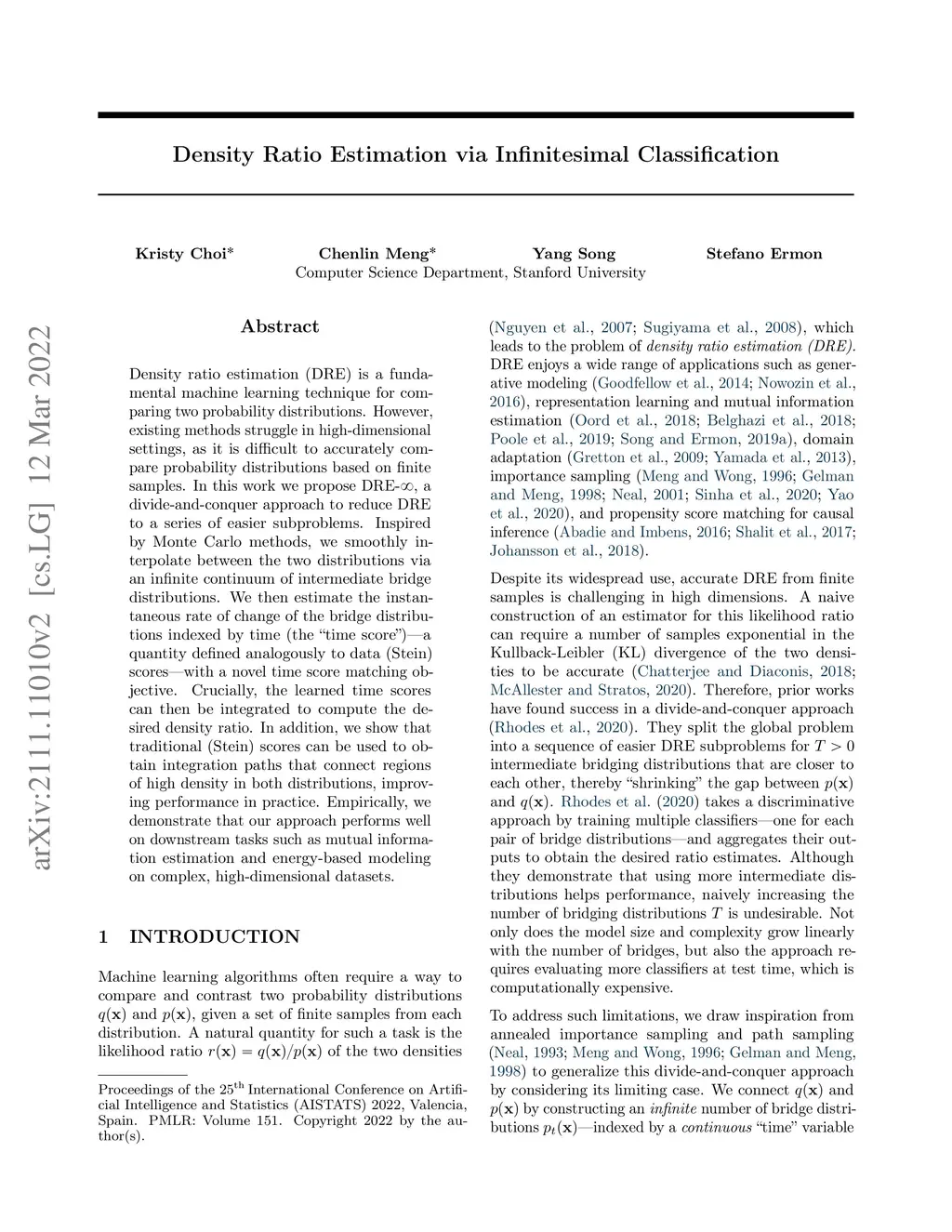 Density ratio estimation (DRE) is a fundamental machine learning technique for comparing two probability distributions. However, existing methods struggle in high-dimensional settings, as it is difficult to accurately compare probability distributions based on finite samples. In this work we propose DRE-\infty, a divide-and-conquer approach to reduce DRE to a series of easier subproblems. Inspired by Monte Carlo methods, we smoothly interpolate between the two distributions via an infinite continuum of intermediate bridge distributions. We then estimate the instantaneous rate of change of the bridge distributions indexed by time (the "time score") -- a quantity defined analogously to data (Stein) scores -- with a novel time score matching objective. Crucially, the learned time scores can then be integrated to compute the desired density ratio. In addition, we show that traditional (Stein) scores can be used to obtain integration paths that connect regions of high density in both distributions, improving performance in practice. Empirically, we demonstrate that our approach performs well on downstream tasks such as mutual information estimation and energy-based modeling on complex, high-dimensional datasets.