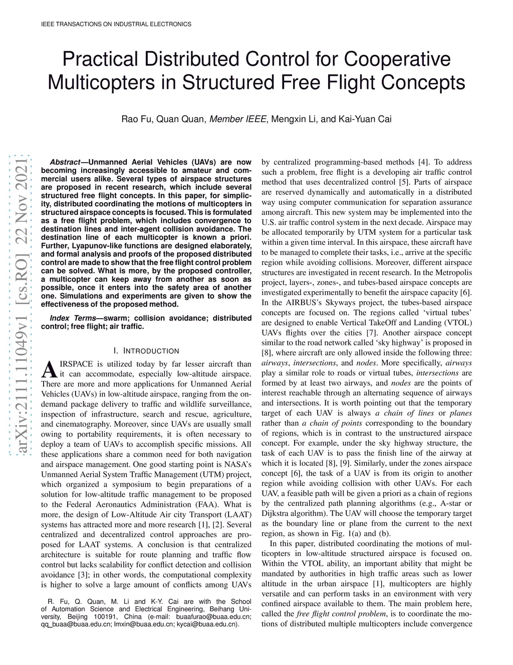 Unmanned Aerial Vehicles (UAVs) are now becoming increasingly accessible to amateur and com-mercial users alike. Several types of airspace structures are proposed in recent research, which include several structured free flight concepts. In this paper, for simplic-ity, distributed coordinating the motions of multicopters in structured airspace concepts is focused. This is formulated as a free flight problem, which includes convergence to destination lines and inter-agent collision avoidance. The destination line of each multicopter is known a priori. Further, Lyapunov-like functions are designed elaborately, and formal analysis and proofs of the proposed distributed control are made to show that the free flight control problem can be solved. What is more, by the proposed controller, a multicopter can keep away from another as soon as possible, once it enters into the safety area of another one. Simulations and experiments are given to show the effectiveness of the proposed method.