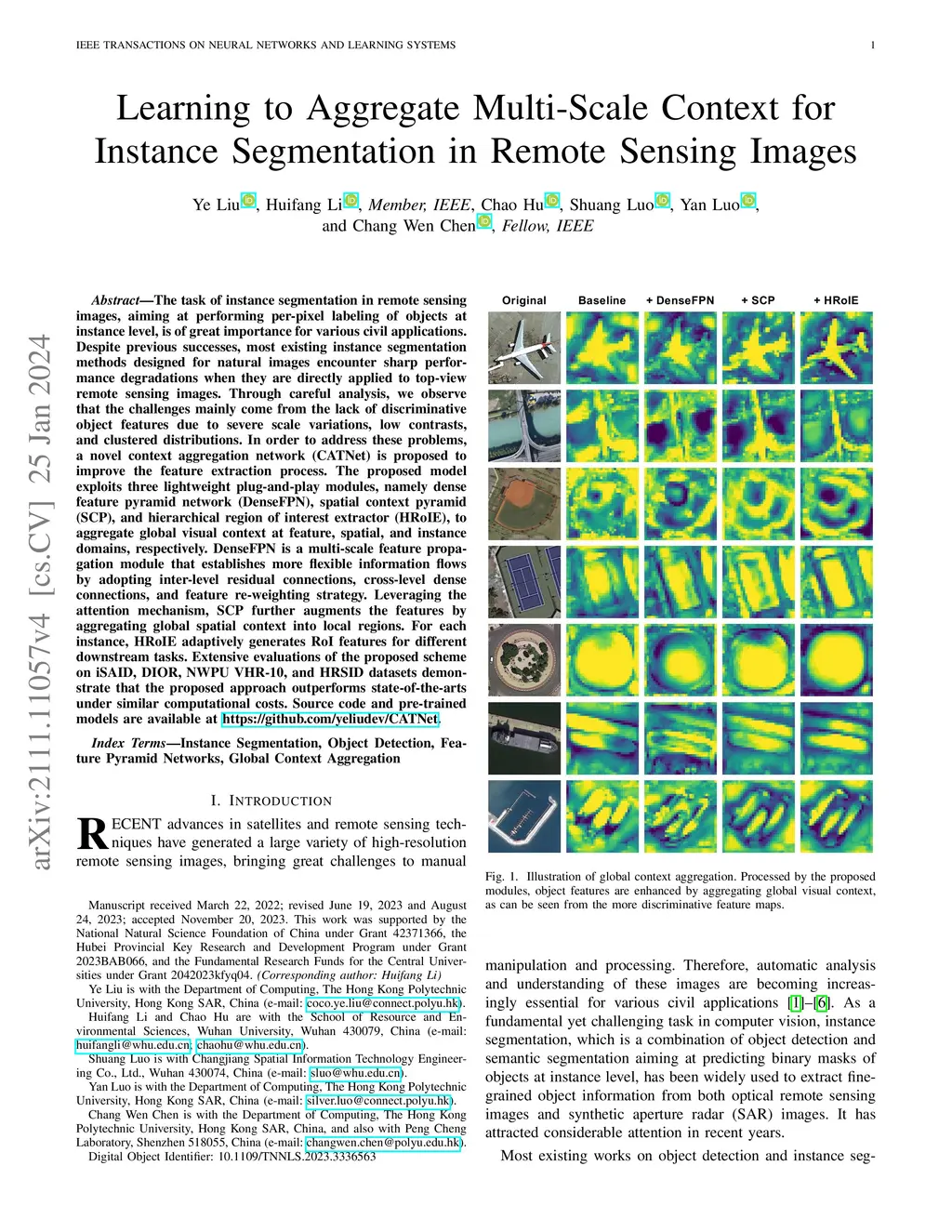 The task of instance segmentation in remote sensing images, aiming at performing per-pixel labeling of objects at instance level, is of great importance for various civil applications. Despite previous successes, most existing instance segmentation methods designed for natural images encounter sharp performance degradations when they are directly applied to top-view remote sensing images. Through careful analysis, we observe that the challenges mainly come from the lack of discriminative object features due to severe scale variations, low contrasts, and clustered distributions. In order to address these problems, a novel context aggregation network (CATNet) is proposed to improve the feature extraction process. The proposed model exploits three lightweight plug-and-play modules, namely dense feature pyramid network (DenseFPN), spatial context pyramid (SCP), and hierarchical region of interest extractor (HRoIE), to aggregate global visual context at feature, spatial, and instance domains, respectively. DenseFPN is a multi-scale feature propagation module that establishes more flexible information flows by adopting inter-level residual connections, cross-level dense connections, and feature re-weighting strategy. Leveraging the attention mechanism, SCP further augments the features by aggregating global spatial context into local regions. For each instance, HRoIE adaptively generates RoI features for different downstream tasks. We carry out extensive evaluations of the proposed scheme on the challenging iSAID, DIOR, NWPU VHR-10, and HRSID datasets. The evaluation results demonstrate that the proposed approach outperforms state-of-the-arts under similar computational costs. Source code and pre-trained models are available at https://github.com/yeliudev/CATNet.