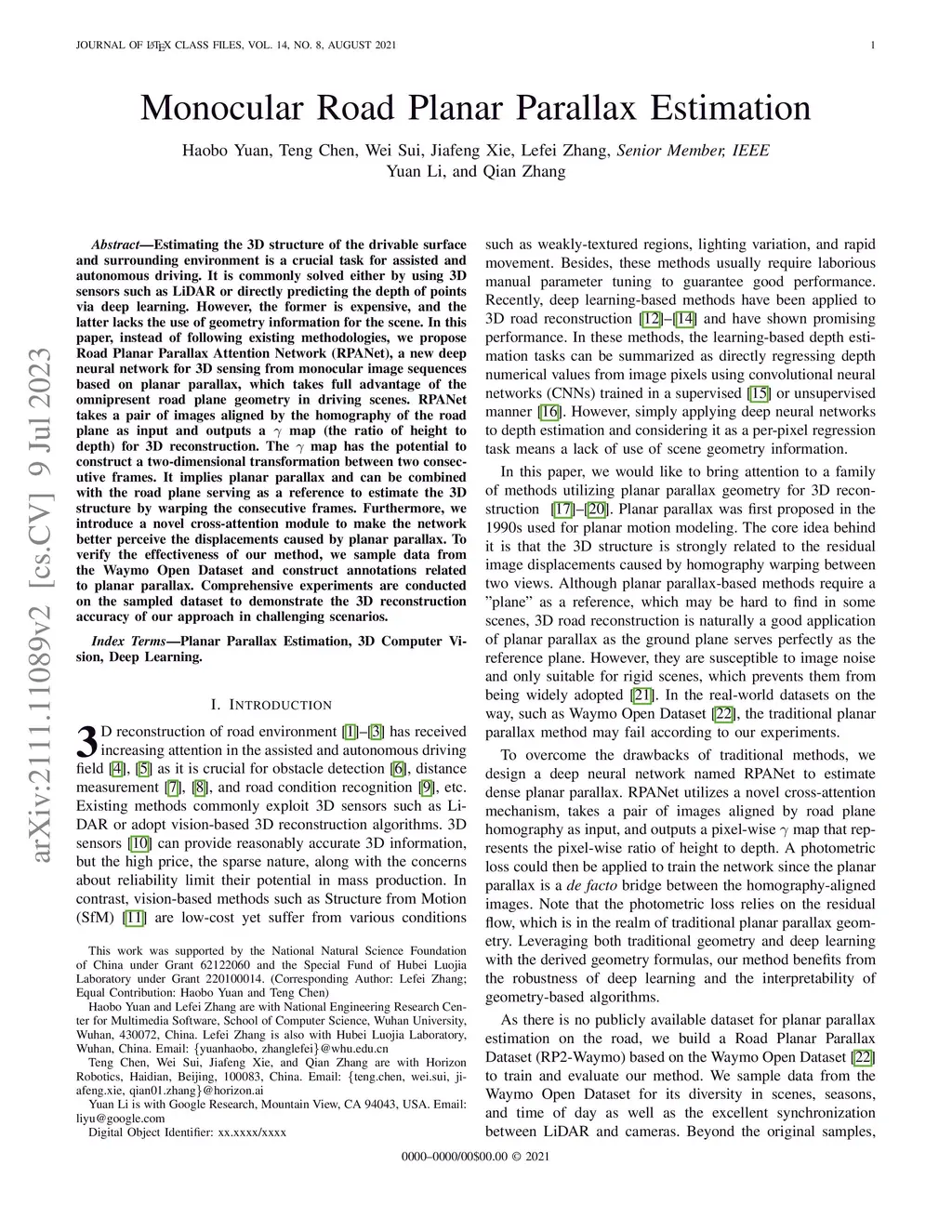 Monocular Road Planar Parallax Estimation