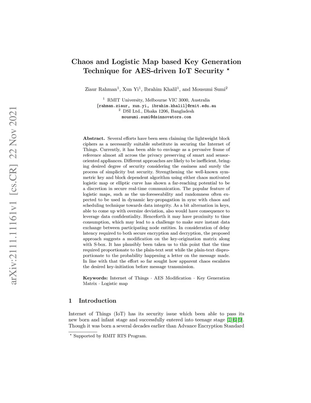 Chaos and Logistic Map based Key Generation Technique for AES-driven IoT