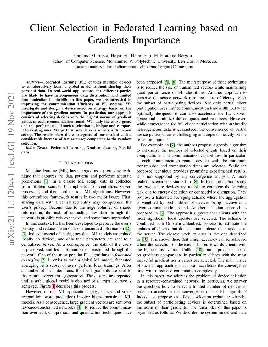 Federated learning (FL) enables multiple devices to collaboratively learn a global model without sharing their personal data. In real-world applications, the different parties are likely to have heterogeneous data distribution and limited communication bandwidth. In this paper, we are interested in improving the communication efficiency of FL systems. We investigate and design a device selection strategy based on the importance of the gradient norms. In particular, our approach consists of selecting devices with the highest norms of gradient values at each communication round. We study the convergence and the performance of such a selection technique and compare it to existing ones. We perform several experiments with non-iid set-up. The results show the convergence of our method with a considerable increase of test accuracy comparing to the random selection.