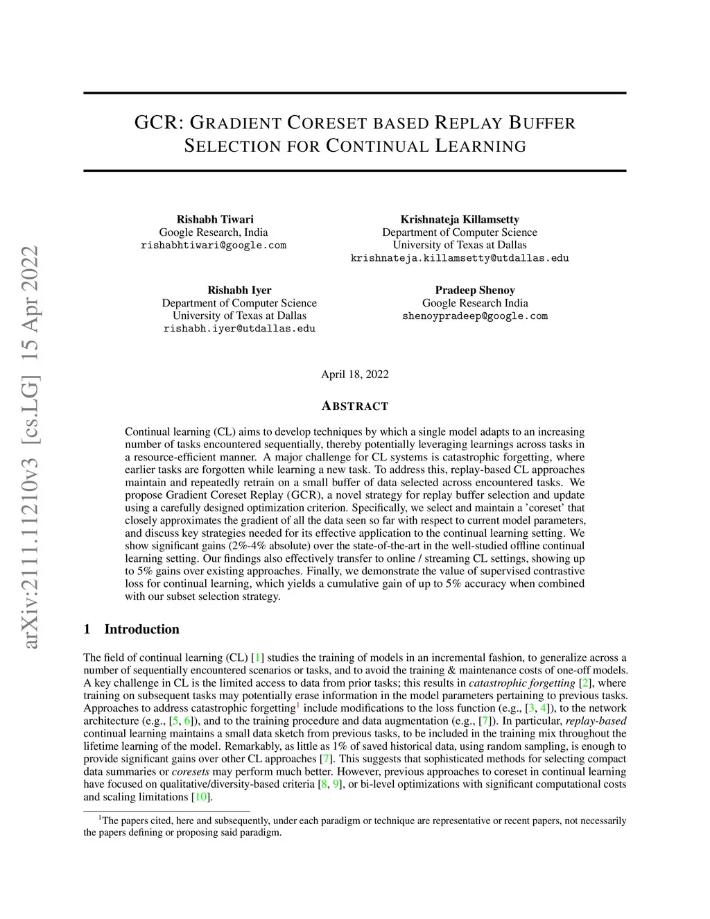 Continual learning (CL) aims to develop techniques by which a single model adapts to an increasing number of tasks encountered sequentially, thereby potentially leveraging learnings across tasks in a resource-efficient manner. A major challenge for CL systems is catastrophic forgetting, where earlier tasks are forgotten while learning a new task. To address this, replay-based CL approaches maintain and repeatedly retrain on a small buffer of data selected across encountered tasks. We propose Gradient Coreset Replay (GCR), a novel strategy for replay buffer selection and update using a carefully designed optimization criterion. Specifically, we select and maintain a "coreset" that closely approximates the gradient of all the data seen so far with respect to current model parameters, and discuss key strategies needed for its effective application to the continual learning setting. We show significant gains (2%-4% absolute) over the state-of-the-art in the well-studied offline continual learning setting. Our findings also effectively transfer to online / streaming CL settings, showing upto 5% gains over existing approaches. Finally, we demonstrate the value of supervised contrastive loss for continual learning, which yields a cumulative gain of up to 5% accuracy when combined with our subset selection strategy.