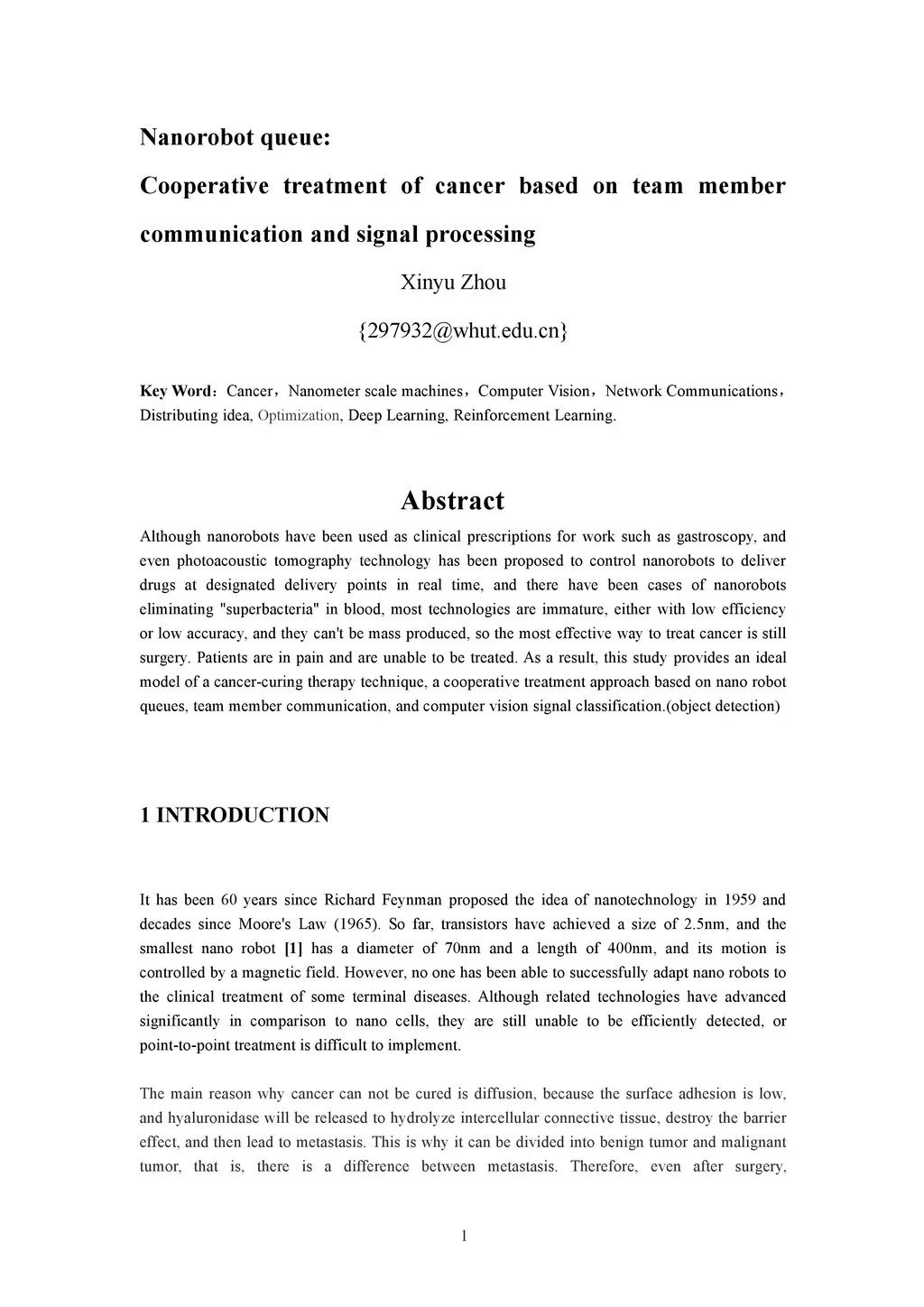 Although nanorobots have been used as clinical prescriptions for work such as gastroscopy, and even photoacoustic tomography technology has been proposed to control nanorobots to deliver drugs at designated delivery points in real time, and there are cases of eliminating "superbacteria" in blood through nanorobots, most technologies are immature, either with low efficiency or low accuracy, Either it can not be mass produced, so the most effective way to treat cancer diseases at this stage is through chemotherapy and radiotherapy. Patients are suffering and can not be cured. Therefore, this paper proposes an ideal model of a treatment method that can completely cure cancer, a cooperative treatment method based on nano robot queue through team member communication and computer vision image classification (target detection).