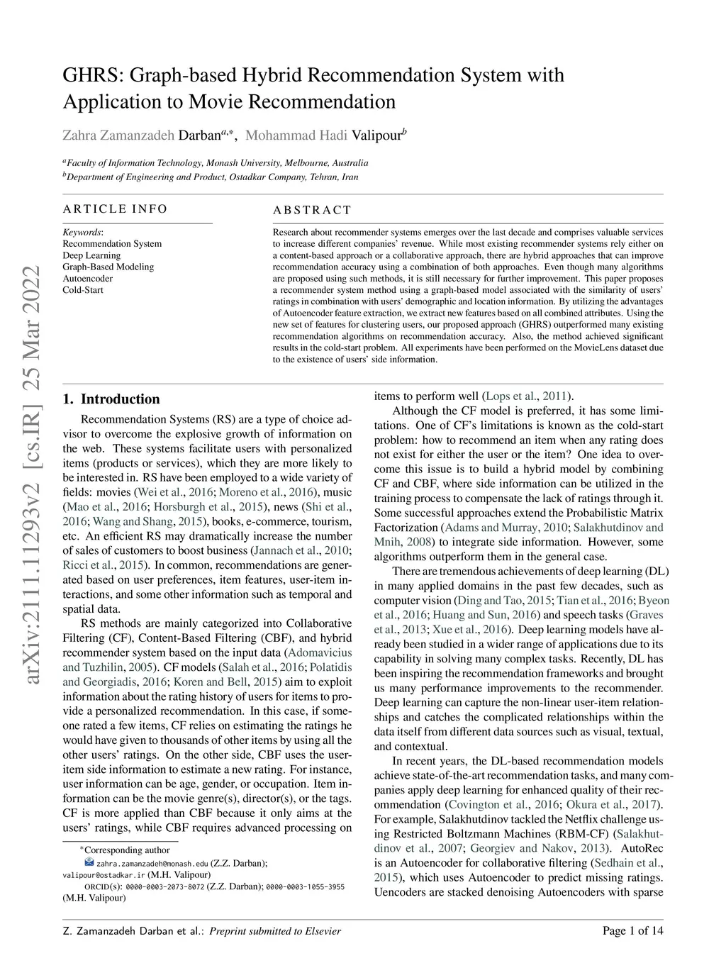 Research about recommender systems emerges over the last decade and comprises valuable services to increase different companies' revenue. Several approaches exist in handling paper recommender systems. While most existing recommender systems rely either on a content-based approach or a collaborative approach, there are hybrid approaches that can improve recommendation accuracy using a combination of both approaches. Even though many algorithms are proposed using such methods, it is still necessary for further improvement. In this paper, we propose a recommender system method using a graph-based model associated with the similarity of users' ratings, in combination with users' demographic and location information. By utilizing the advantages of Autoencoder feature extraction, we extract new features based on all combined attributes. Using the new set of features for clustering users, our proposed approach (GHRS) has gained a significant improvement, which dominates other methods' performance in the cold-start problem. The experimental results on the MovieLens dataset show that the proposed algorithm outperforms many existing recommendation algorithms on recommendation accuracy.