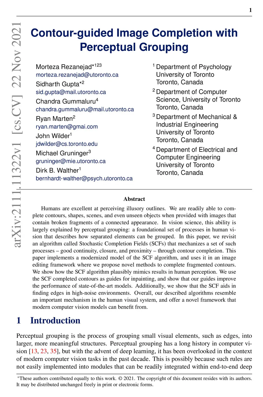 Humans are excellent at perceiving illusory outlines. We are readily able to complete contours, shapes, scenes, and even unseen objects when provided with images that contain broken fragments of a connected appearance. In vision science, this ability is largely explained by perceptual grouping: a foundational set of processes in human vision that describes how separated elements can be grouped. In this paper, we revisit an algorithm called Stochastic Completion Fields (SCFs) that mechanizes a set of such processes -- good continuity, closure, and proximity -- through contour completion. This paper implements a modernized model of the SCF algorithm, and uses it in an image editing framework where we propose novel methods to complete fragmented contours. We show how the SCF algorithm plausibly mimics results in human perception. We use the SCF completed contours as guides for inpainting, and show that our guides improve the performance of state-of-the-art models. Additionally, we show that the SCF aids in finding edges in high-noise environments. Overall, our described algorithms resemble an important mechanism in the human visual system, and offer a novel framework that modern computer vision models can benefit from.