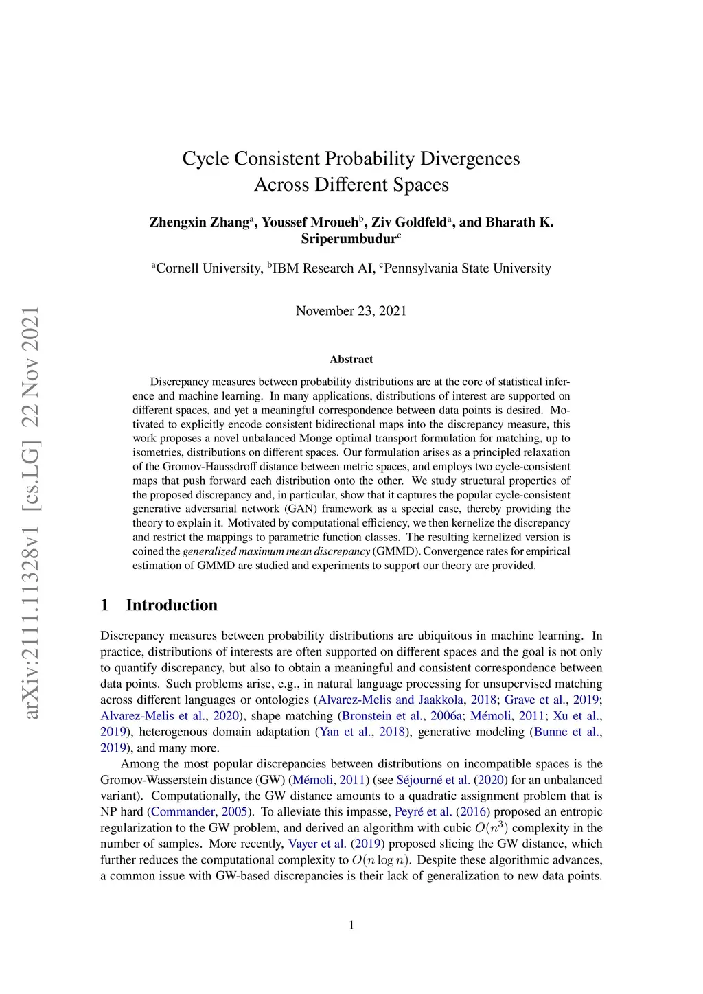 Discrepancy measures between probability distributions are at the core of statistical inference and machine learning. In many applications, distributions of interest are supported on different spaces, and yet a meaningful correspondence between data points is desired. Motivated to explicitly encode consistent bidirectional maps into the discrepancy measure, this work proposes a novel unbalanced Monge optimal transport formulation for matching, up to isometries, distributions on different spaces. Our formulation arises as a principled relaxation of the Gromov-Haussdroff distance between metric spaces, and employs two cycle-consistent maps that push forward each distribution onto the other. We study structural properties of the proposed discrepancy and, in particular, show that it captures the popular cycle-consistent generative adversarial network (GAN) framework as a special case, thereby providing the theory to explain it. Motivated by computational efficiency, we then kernelize the discrepancy and restrict the mappings to parametric function classes. The resulting kernelized version is coined the generalized maximum mean discrepancy (GMMD). Convergence rates for empirical estimation of GMMD are studied and experiments to support our theory are provided.