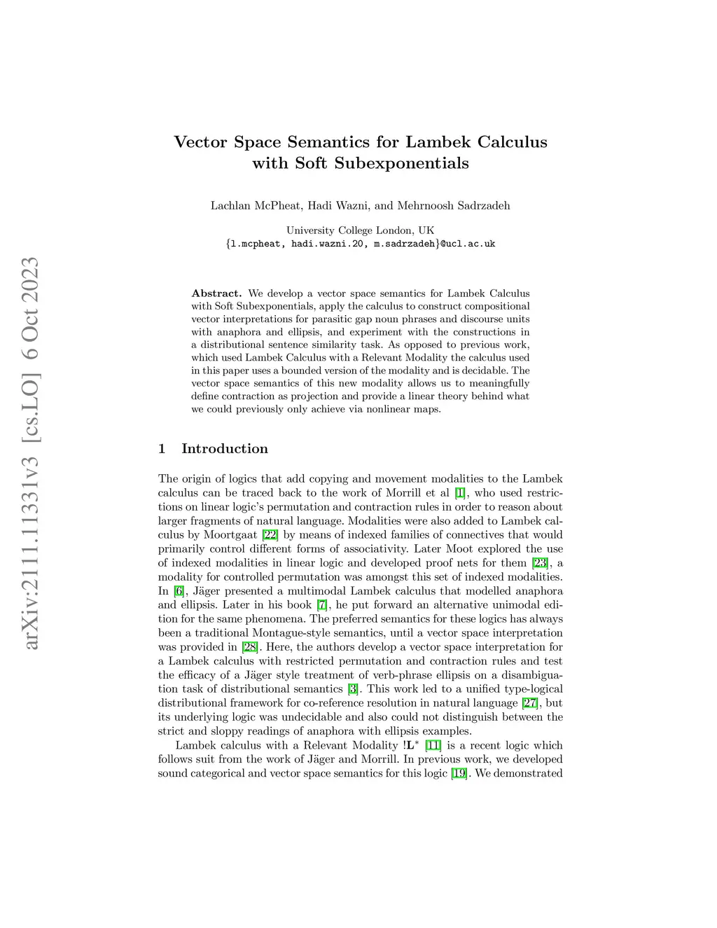 We develop a vector space semantics for Lambek Calculus with Soft Subexponentials, apply the calculus to construct compositional vector interpretations for parasitic gap noun phrases and discourse units with anaphora and ellipsis, and experiment with the constructions in a distributional sentence similarity task. As opposed to previous work, which used Lambek Calculus with a Relevant Modality the calculus used in this paper uses a bounded version of the modality and is decidable. The vector space semantics of this new modality allows us to meaningfully define contraction as projection and provide a linear theory behind what we could previously only achieve via nonlinear maps.