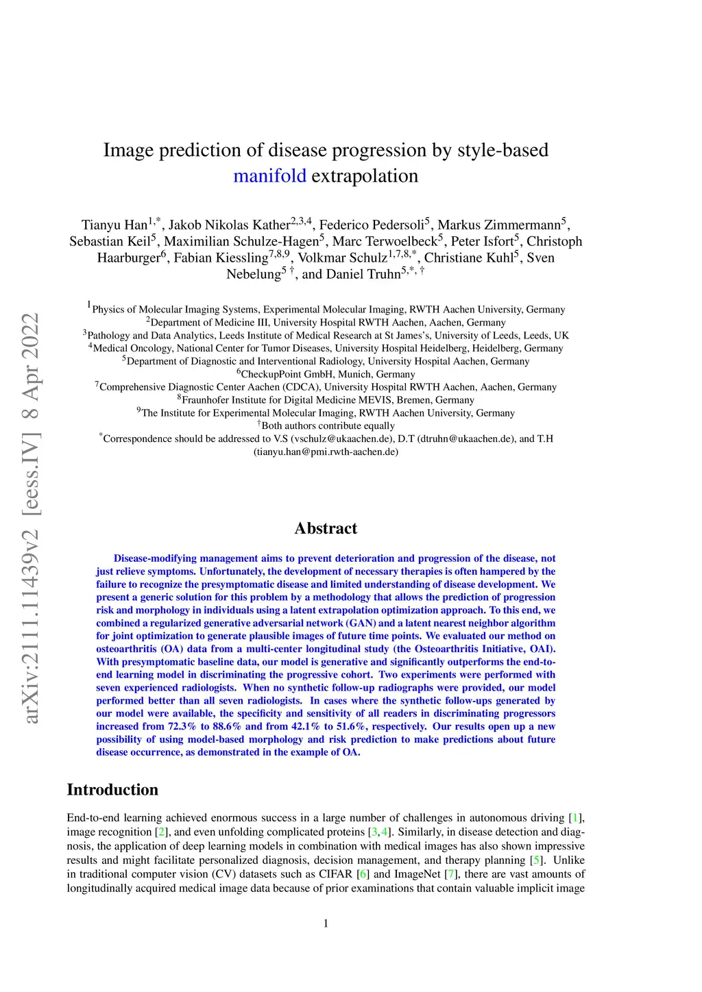 Disease-modifying management aims to prevent deterioration and progression of the disease, not just relieve symptoms. Unfortunately, the development of necessary therapies is often hampered by the failure to recognize the presymptomatic disease and limited understanding of disease development. We present a generic solution for this problem by a methodology that allows the prediction of progression risk and morphology in individuals using a latent extrapolation optimization approach. To this end, we combined a regularized generative adversarial network (GAN) and a latent nearest neighbor algorithm for joint optimization to generate plausible images of future time points. We evaluated our method on osteoarthritis (OA) data from a multi-center longitudinal study (the Osteoarthritis Initiative, OAI). With presymptomatic baseline data, our model is generative and significantly outperforms the end-to-end learning model in discriminating the progressive cohort. Two experiments were performed with seven experienced radiologists. When no synthetic follow-up radiographs were provided, our model performed better than all seven radiologists. In cases where the synthetic follow-ups generated by our model were available, the specificity and sensitivity of all readers in discriminating progressors increased from to and from to , respectively. Our results open up a new possibility of using model-based morphology and risk prediction to make predictions about future disease occurrence, as demonstrated in the example of OA.