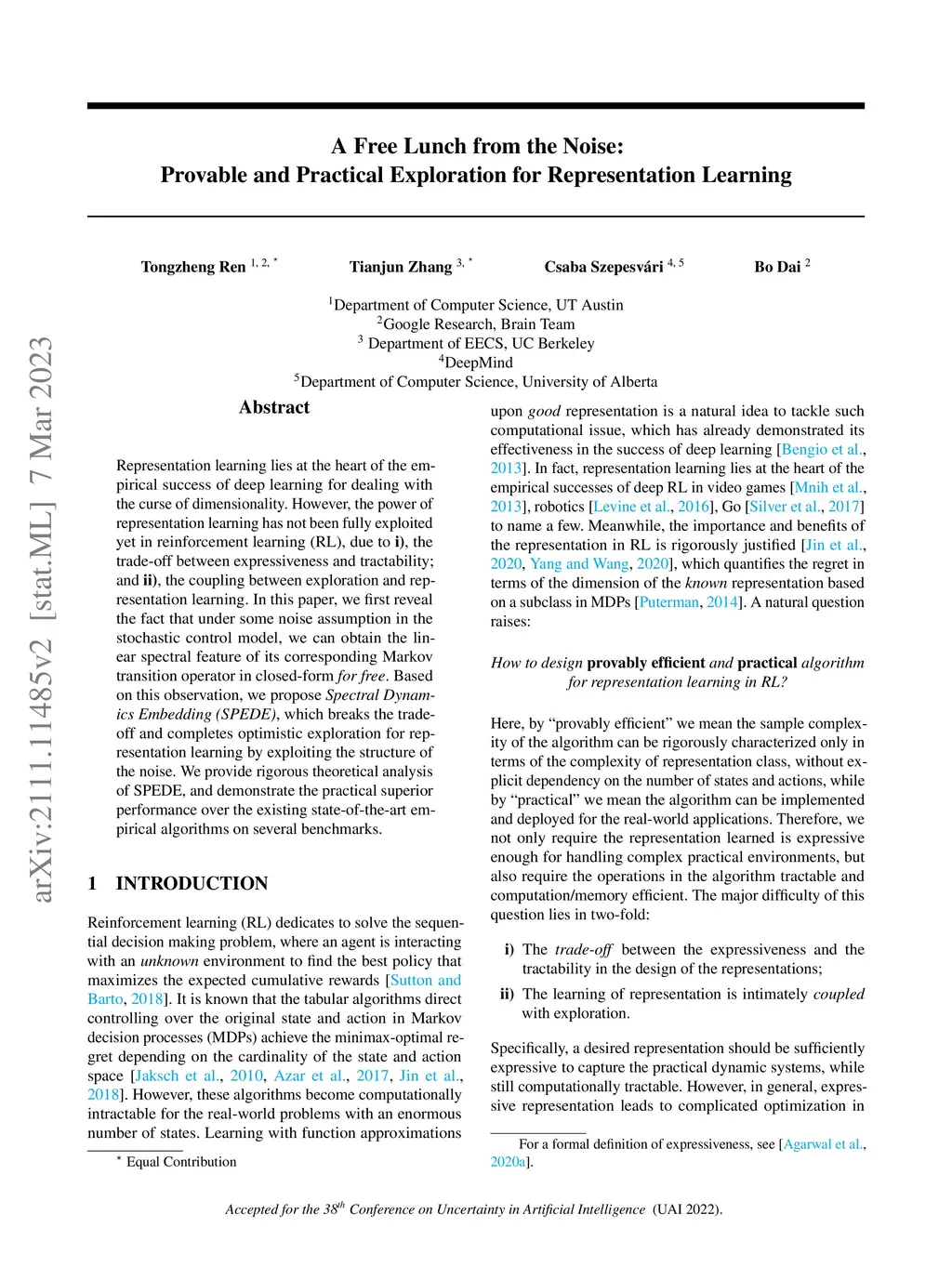 Representation learning lies at the heart of the empirical success of deep learning for dealing with the curse of dimensionality. However, the power of representation learning has not been fully exploited yet in reinforcement learning (RL), due to i), the trade-off between expressiveness and tractability; and ii), the coupling between exploration and representation learning. In this paper, we first reveal the fact that under some noise assumption in the stochastic control model, we can obtain the linear spectral feature of its corresponding Markov transition operator in closed-form for free. Based on this observation, we propose Spectral Dynamics Embedding (SPEDE), which breaks the trade-off and completes optimistic exploration for representation learning by exploiting the structure of the noise. We provide rigorous theoretical analysis of SPEDE, and demonstrate the practical superior performance over the existing state-of-the-art empirical algorithms on several benchmarks.