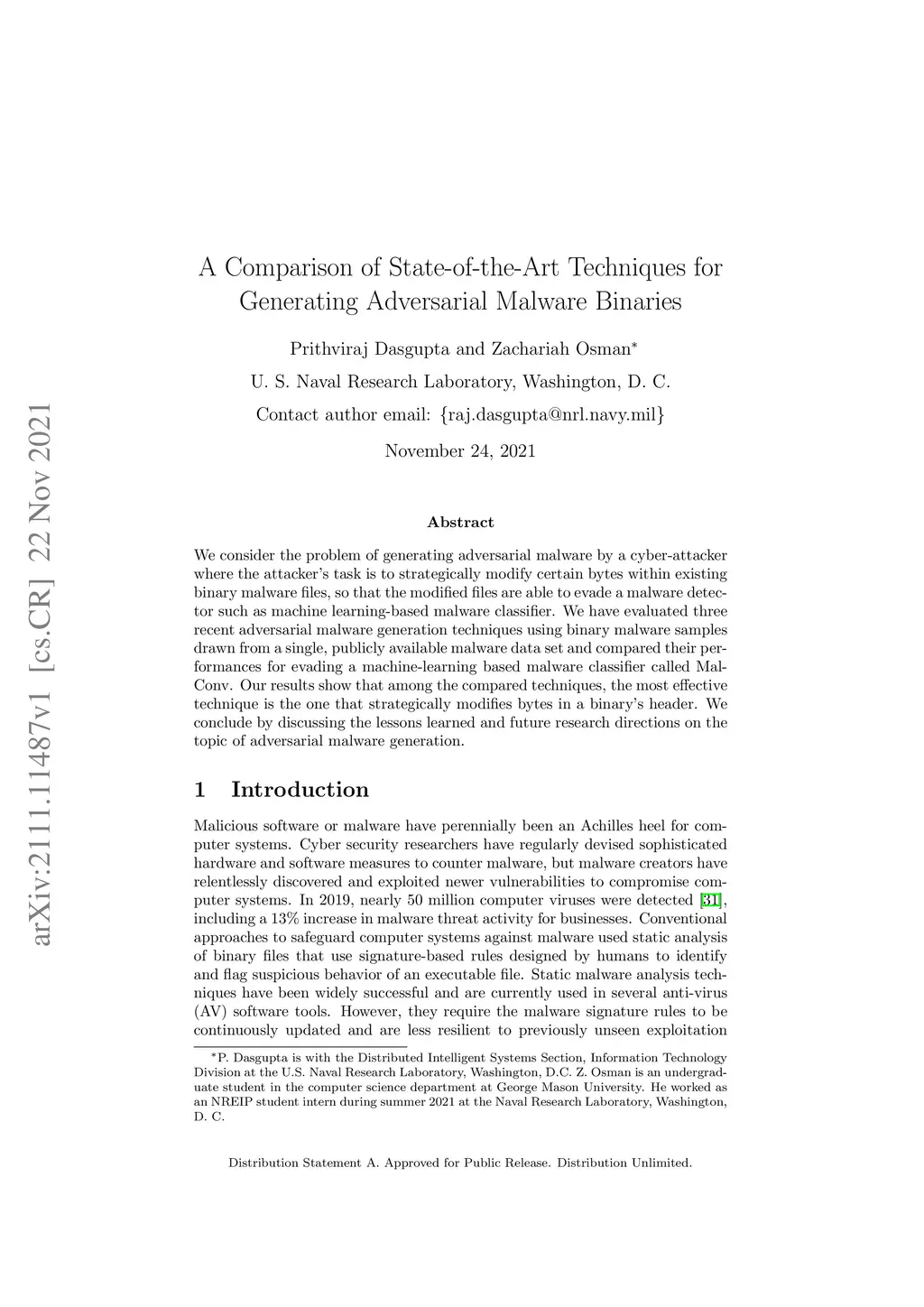 We consider the problem of generating adversarial malware by a cyber-attacker where the attacker's task is to strategically modify certain bytes within existing binary malware files, so that the modified files are able to evade a malware detector such as machine learning-based malware classifier. We have evaluated three recent adversarial malware generation techniques using binary malware samples drawn from a single, publicly available malware data set and compared their performances for evading a machine-learning based malware classifier called MalConv. Our results show that among the compared techniques, the most effective technique is the one that strategically modifies bytes in a binary's header. We conclude by discussing the lessons learned and future research directions on the topic of adversarial malware generation.