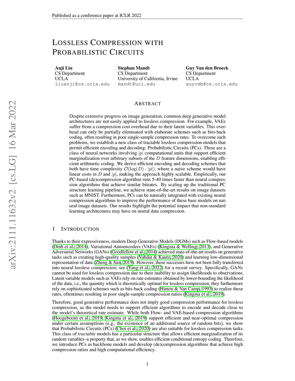 Despite extensive progress on image generation, common deep generative model architectures are not easily applied to lossless compression. For example, VAEs suffer from a compression cost overhead due to their latent variables. This overhead can only be partially eliminated with elaborate schemes such as bits-back coding, often resulting in poor single-sample compression rates. To overcome such problems, we establish a new class of tractable lossless compression models that permit efficient encoding and decoding: Probabilistic Circuits (PCs). These are a class of neural networks involving computational units that support efficient marginalization over arbitrary subsets of the feature dimensions, enabling efficient arithmetic coding. We derive efficient encoding and decoding schemes that both have time complexity , where a naive scheme would have linear costs in and , making the approach highly scalable. Empirically, our PC-based (de)compression algorithm runs 5-40 times faster than neural compression algorithms that achieve similar bitrates. By scaling up the traditional PC structure learning pipeline, we achieve state-of-the-art results on image datasets such as MNIST. Furthermore, PCs can be naturally integrated with existing neural compression algorithms to improve the performance of these base models on natural image datasets. Our results highlight the potential impact that non-standard learning architectures may have on neural data compression.