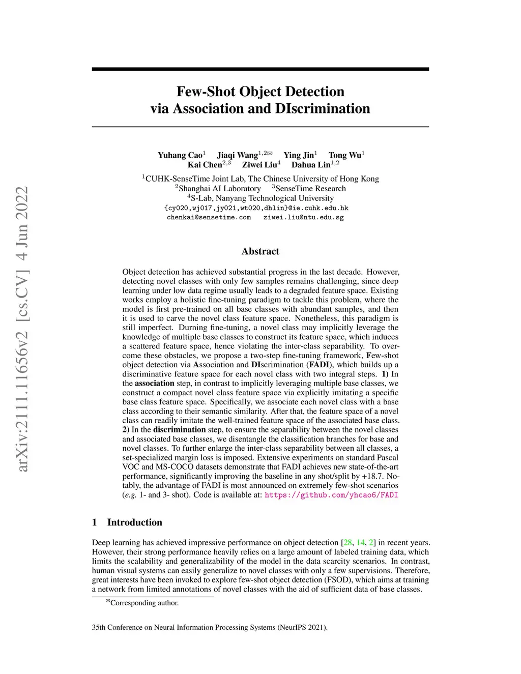 Few-Shot Object Detection via Association and DIscrimination