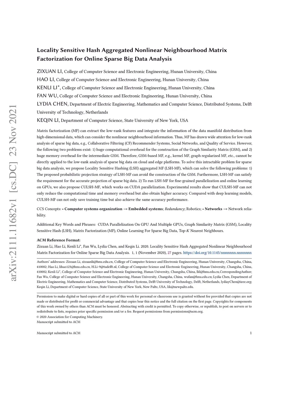 Matrix factorization (MF) can extract the low-rank features and integrate the information of the data manifold distribution from high-dimensional data, which can consider the nonlinear neighbourhood information. Thus, MF has drawn wide attention for low-rank analysis of sparse big data, e.g., Collaborative Filtering (CF) Recommender Systems, Social Networks, and Quality of Service. However, the following two problems exist: 1) huge computational overhead for the construction of the Graph Similarity Matrix (GSM), and 2) huge memory overhead for the intermediate GSM. Therefore, GSM-based MF, e.g., kernel MF, graph regularized MF, etc., cannot be directly applied to the low-rank analysis of sparse big data on cloud and edge platforms. To solve this intractable problem for sparse big data analysis, we propose Locality Sensitive Hashing (LSH) aggregated MF (LSH-MF), which can solve the following problems: 1) The proposed probabilistic projection strategy of LSH-MF can avoid the construction of the GSM. Furthermore, LSH-MF can satisfy the requirement for the accurate projection of sparse big data. 2) To run LSH-MF for fine-grained parallelization and online learning on GPUs, we also propose CULSH-MF, which works on CUDA parallelization. Experimental results show that CULSH-MF can not only reduce the computational time and memory overhead but also obtain higher accuracy. Compared with deep learning models, CULSH-MF can not only save training time but also achieve the same accuracy performance.