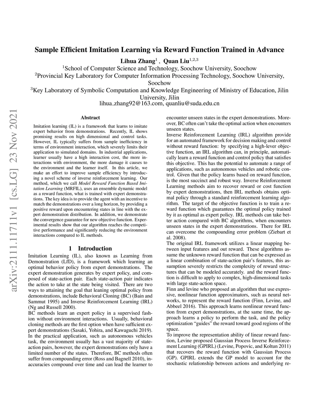 Imitation learning (IL) is a framework that learns to imitate expert behavior from demonstrations. Recently, IL shows promising results on high dimensional and control tasks. However, IL typically suffers from sample inefficiency in terms of environment interaction, which severely limits their application to simulated domains. In industrial applications, learner usually have a high interaction cost, the more interactions with environment, the more damage it causes to the environment and the learner itself. In this article, we make an effort to improve sample efficiency by introducing a novel scheme of inverse reinforcement learning. Our method, which we call \textit{Model Reward Function Based Imitation Learning} (MRFIL), uses an ensemble dynamic model as a reward function, what is trained with expert demonstrations. The key idea is to provide the agent with an incentive to match the demonstrations over a long horizon, by providing a positive reward upon encountering states in line with the expert demonstration distribution. In addition, we demonstrate the convergence guarantee for new objective function. Experimental results show that our algorithm reaches the competitive performance and significantly reducing the environment interactions compared to IL methods.