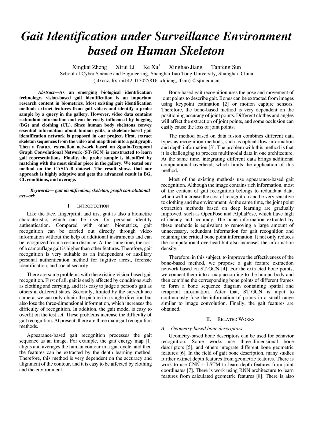 As an emerging biological identification technology, vision-based gait identification is an important research content in biometrics. Most existing gait identification methods extract features from gait videos and identify a probe sample by a query in the gallery. However, video data contains redundant information and can be easily influenced by bagging (BG) and clothing (CL). Since human body skeletons convey essential information about human gaits, a skeleton-based gait identification network is proposed in our project. First, extract skeleton sequences from the video and map them into a gait graph. Then a feature extraction network based on Spatio-Temporal Graph Convolutional Network (ST-GCN) is constructed to learn gait representations. Finally, the probe sample is identified by matching with the most similar piece in the gallery. We tested our method on the CASIA-B dataset. The result shows that our approach is highly adaptive and gets the advanced result in BG, CL conditions, and average.