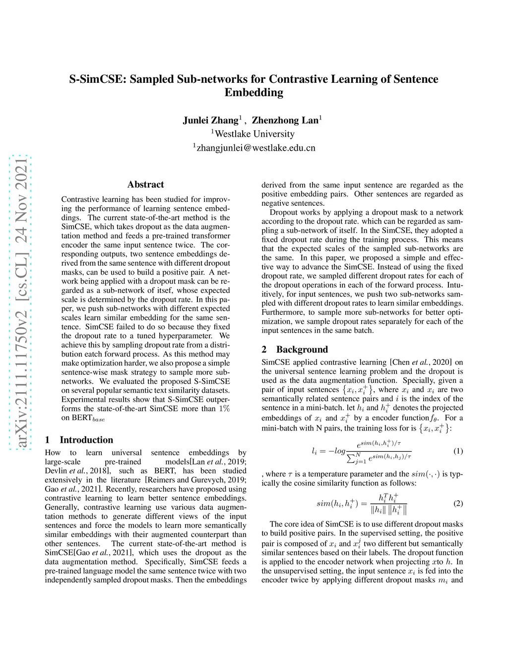 Contrastive learning has been studied for improving the performance of learning sentence embeddings. The current state-of-the-art method is the SimCSE, which takes dropout as the data augmentation method and feeds a pre-trained transformer encoder the same input sentence twice. The corresponding outputs, two sentence embeddings derived from the same sentence with different dropout masks, can be used to build a positive pair. A network being applied with a dropout mask can be regarded as a sub-network of itsef, whose expected scale is determined by the dropout rate. In this paper, we push sub-networks with different expected scales learn similar embedding for the same sentence. SimCSE failed to do so because they fixed the dropout rate to a tuned hyperparameter. We achieve this by sampling dropout rate from a distribution eatch forward process. As this method may make optimization harder, we also propose a simple sentence-wise mask strategy to sample more sub-networks. We evaluated the proposed S-SimCSE on several popular semantic text similarity datasets. Experimental results show that S-SimCSE outperforms the state-of-the-art SimCSE more than on BERT