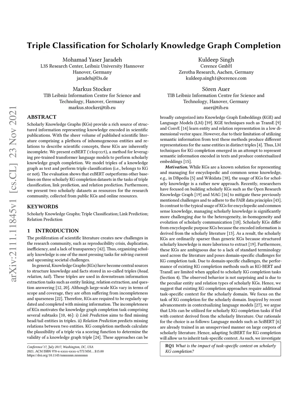 Scholarly Knowledge Graphs (KGs) provide a rich source of structured information representing knowledge encoded in scientific publications. With the sheer volume of published scientific literature comprising a plethora of inhomogeneous entities and relations to describe scientific concepts, these KGs are inherently incomplete. We present exBERT, a method for leveraging pre-trained transformer language models to perform scholarly knowledge graph completion. We model triples of a knowledge graph as text and perform triple classification (i.e., belongs to KG or not). The evaluation shows that exBERT outperforms other baselines on three scholarly KG completion datasets in the tasks of triple classification, link prediction, and relation prediction. Furthermore, we present two scholarly datasets as resources for the research community, collected from public KGs and online resources.