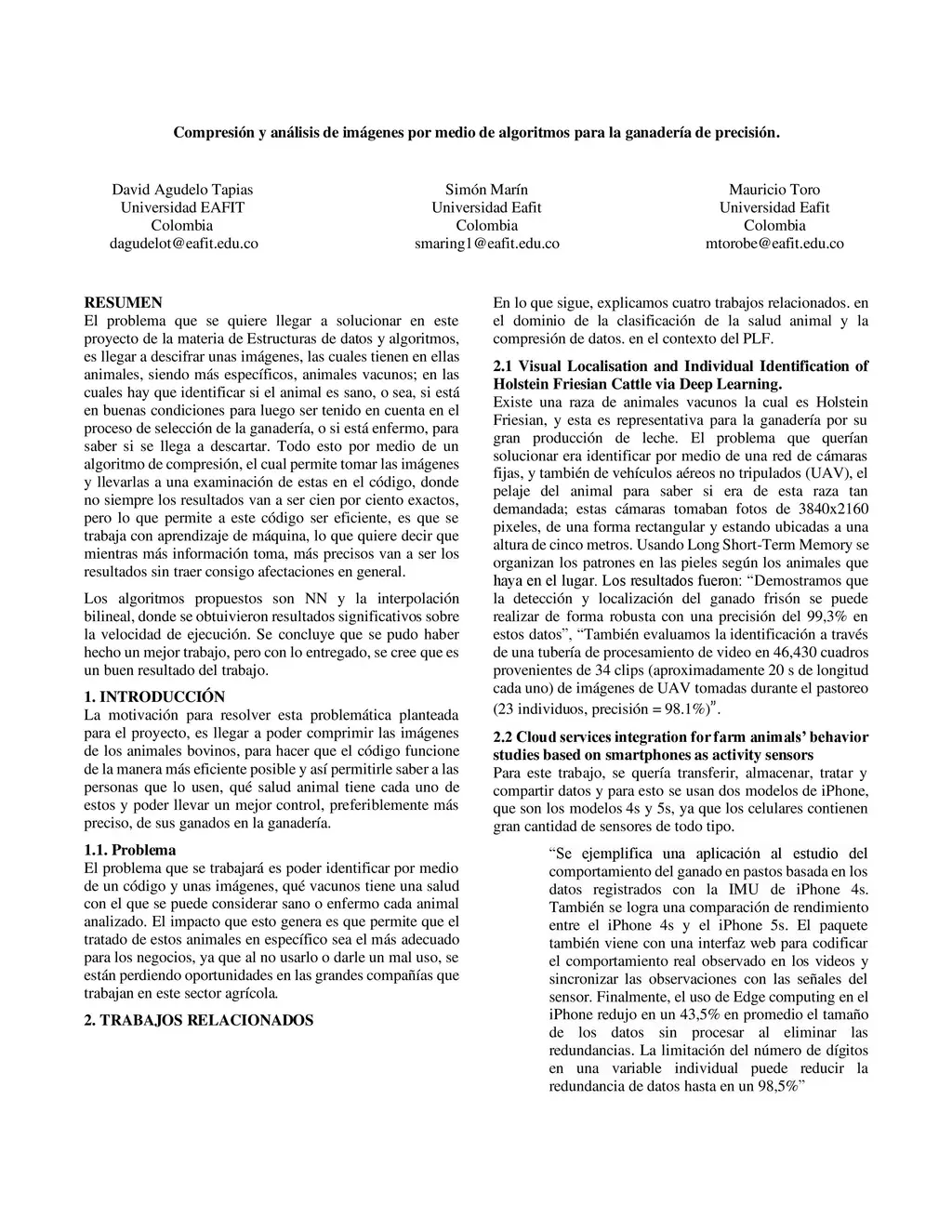 The problem that we want to solve in this project of the subject of Data Structures and Algorithms, is to decipher some images, which have in them animals, being more specific, bovine animals; in which it is necessary to identify if the animal is healthy, that is to say, if it is in good conditions to be taken into account in the process of selection of the cattle, or if it is sick, to know if it is discarded. All this by means of an algorithm of compression, which allows to take the images and to take them to an examination of these in the code, where not always the results are going to be one hundred percent exact, but what allows this code to be efficient, is that it works with machine learning, which means that the more information it takes, the more precise the results are going to be without bringing with it general affectations. The proposed algorithms are NN and bilinear interpolation, where significant results were obtained on the execution speed. It is concluded that a better job could have been done, but with what was delivered, it is believed that it is a good result of the work.