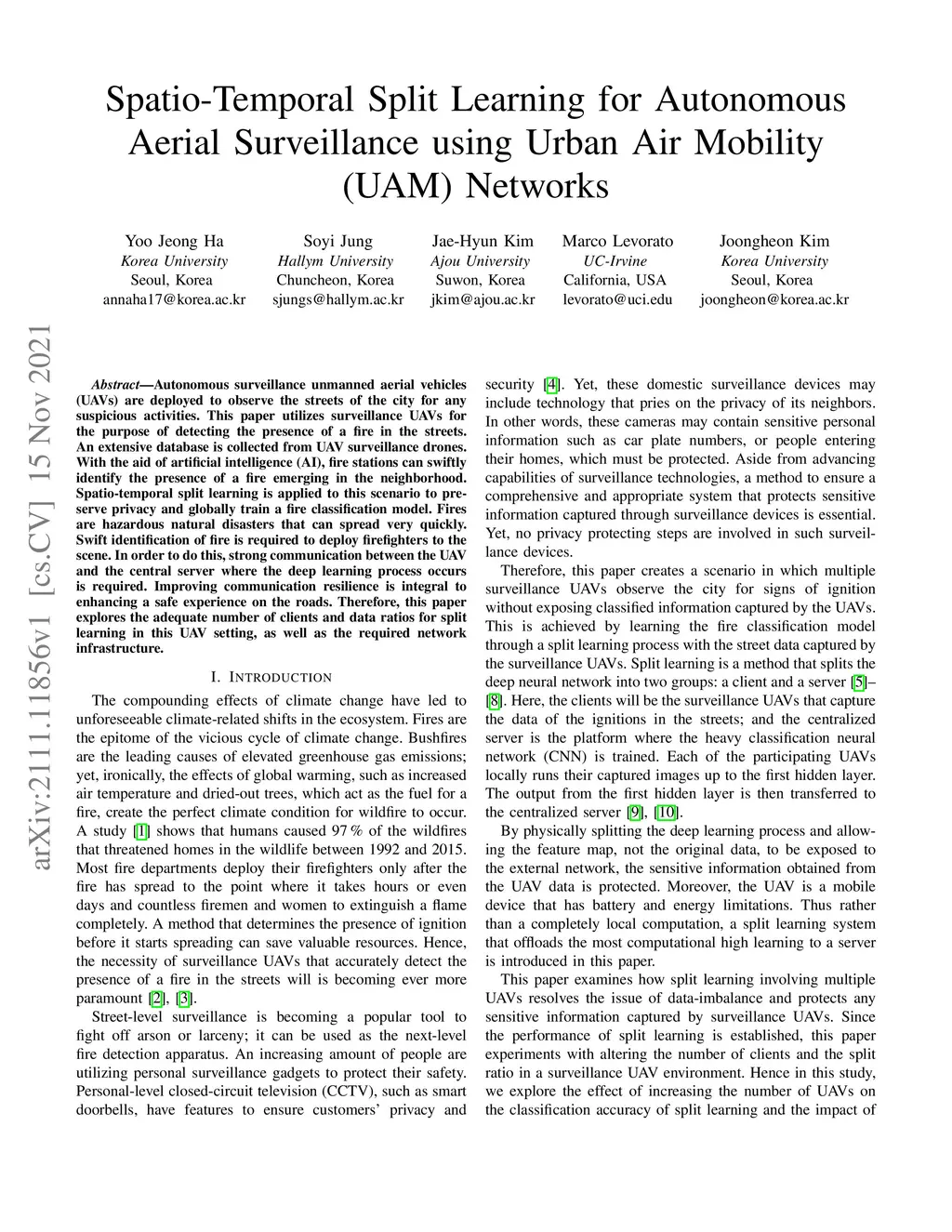 Autonomous surveillance unmanned aerial vehicles (UAVs) are deployed to observe the streets of the city for any suspicious activities. This paper utilizes surveillance UAVs for the purpose of detecting the presence of a fire in the streets. An extensive database is collected from UAV surveillance drones. With the aid of artificial intelligence (AI), fire stations can swiftly identify the presence of a fire emerging in the neighborhood. Spatio-temporal split learning is applied to this scenario to preserve privacy and globally train a fire classification model. Fires are hazardous natural disasters that can spread very quickly. Swift identification of fire is required to deploy firefighters to the scene. In order to do this, strong communication between the UAV and the central server where the deep learning process occurs is required. Improving communication resilience is integral to enhancing a safe experience on the roads. Therefore, this paper explores the adequate number of clients and data ratios for split learning in this UAV setting, as well as the required network infrastructure.