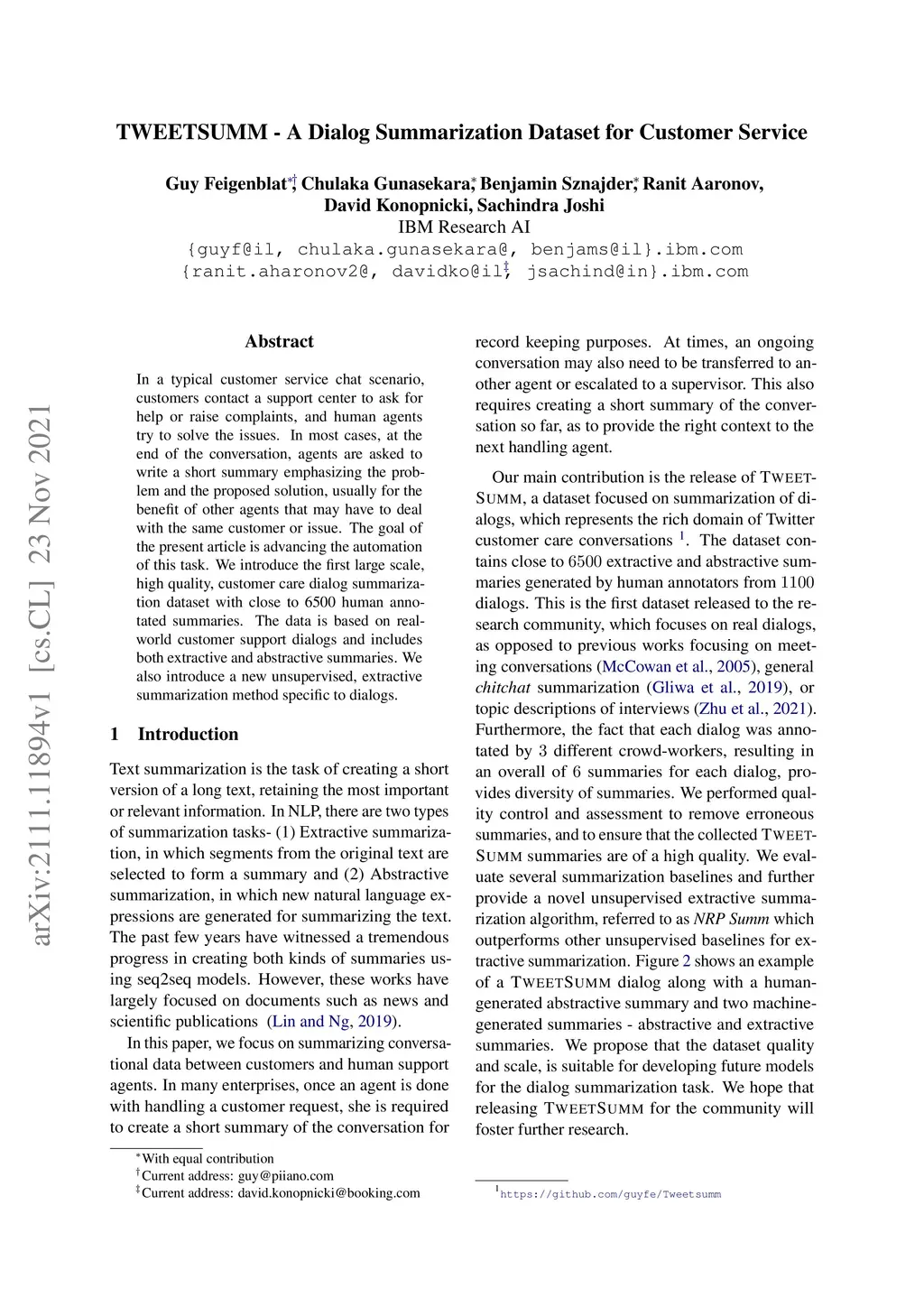 In a typical customer service chat scenario, customers contact a support center to ask for help or raise complaints, and human agents try to solve the issues. In most cases, at the end of the conversation, agents are asked to write a short summary emphasizing the problem and the proposed solution, usually for the benefit of other agents that may have to deal with the same customer or issue. The goal of the present article is advancing the automation of this task. We introduce the first large scale, high quality, customer care dialog summarization dataset with close to 6500 human annotated summaries. The data is based on real-world customer support dialogs and includes both extractive and abstractive summaries. We also introduce a new unsupervised, extractive summarization method specific to dialogs.