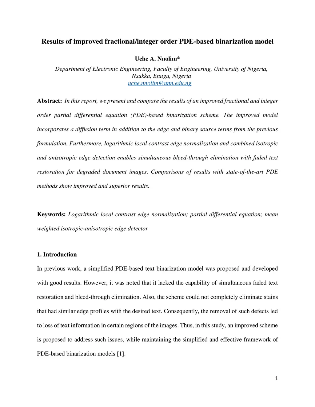 In this report, we present and compare the results of an improved fractional and integer order partial differential equation (PDE)-based binarization scheme. The improved model incorporates a diffusion term in addition to the edge and binary source terms from the previous formulation. Furthermore, logarithmic local contrast edge normalization and combined isotropic and anisotropic edge detection enables simultaneous bleed-through elimination with faded text restoration for degraded document images. Comparisons of results with state-of-the-art PDE methods show improved and superior results.