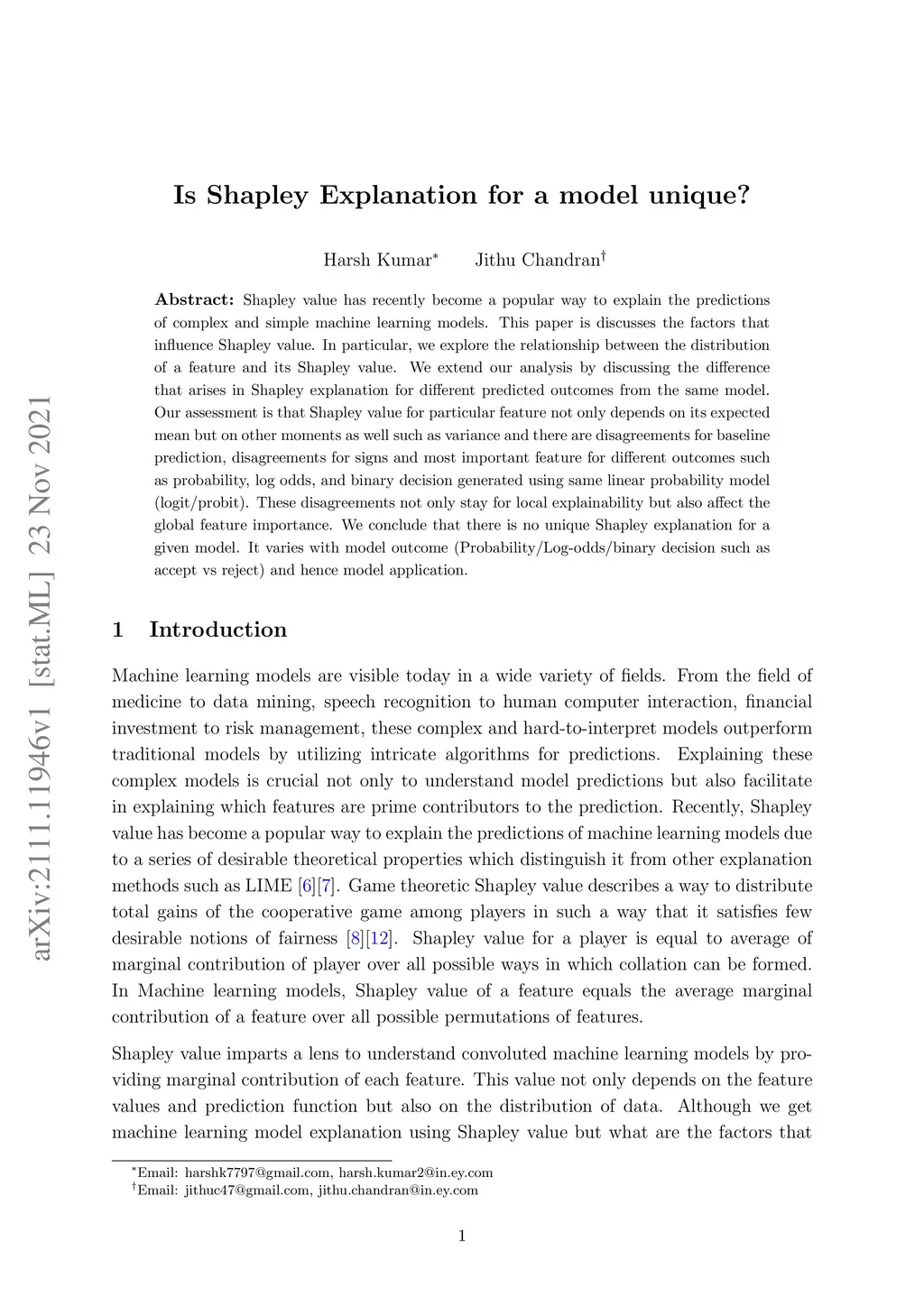 Shapley value has recently become a popular way to explain the predictions of complex and simple machine learning models. This paper is discusses the factors that influence Shapley value. In particular, we explore the relationship between the distribution of a feature and its Shapley value. We extend our analysis by discussing the difference that arises in Shapley explanation for different predicted outcomes from the same model. Our assessment is that Shapley value for particular feature not only depends on its expected mean but on other moments as well such as variance and there are disagreements for baseline prediction, disagreements for signs and most important feature for different outcomes such as probability, log odds, and binary decision generated using same linear probability model (logit/probit). These disagreements not only stay for local explainability but also affect the global feature importance. We conclude that there is no unique Shapley explanation for a given model. It varies with model outcome (Probability/Log-odds/binary decision such as accept vs reject) and hence model application.