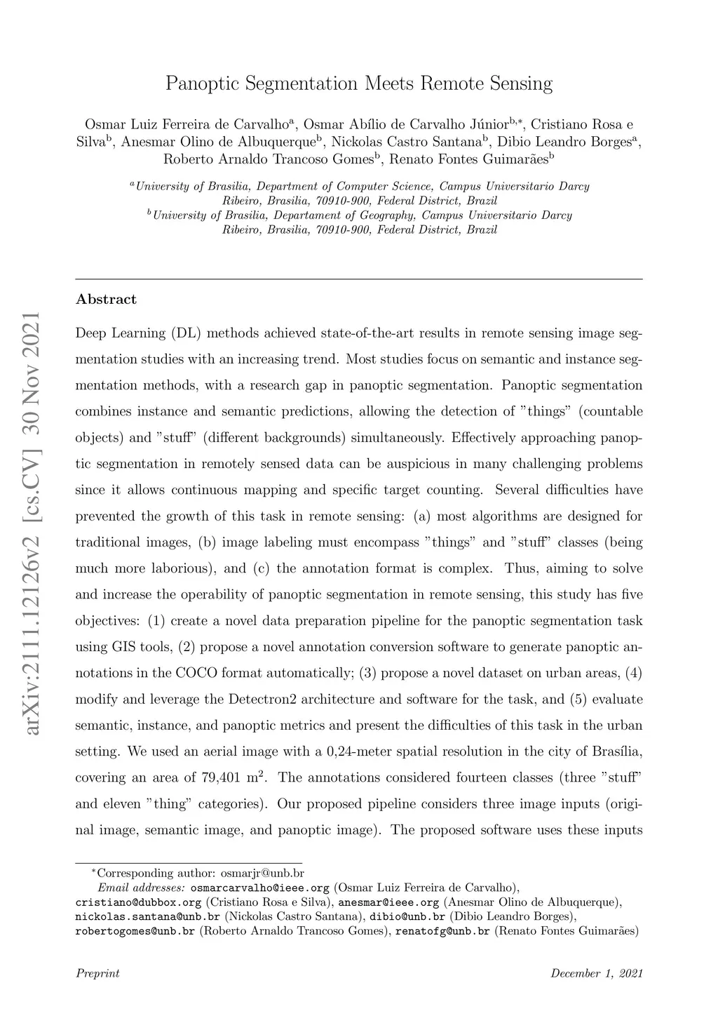 Panoptic segmentation combines instance and semantic predictions, allowing the detection of "things" and "stuff" simultaneously. Effectively approaching panoptic segmentation in remotely sensed data can be auspicious in many challenging problems since it allows continuous mapping and specific target counting. Several difficulties have prevented the growth of this task in remote sensing: (a) most algorithms are designed for traditional images, (b) image labelling must encompass "things" and "stuff" classes, and (c) the annotation format is complex. Thus, aiming to solve and increase the operability of panoptic segmentation in remote sensing, this study has five objectives: (1) create a novel data preparation pipeline for panoptic segmentation, (2) propose an annotation conversion software to generate panoptic annotations; (3) propose a novel dataset on urban areas, (4) modify the Detectron2 for the task, and (5) evaluate difficulties of this task in the urban setting. We used an aerial image with a 0,24-meter spatial resolution considering 14 classes. Our pipeline considers three image inputs, and the proposed software uses point shapefiles for creating samples in the COCO format. Our study generated 3,400 samples with 512x512 pixel dimensions. We used the Panoptic-FPN with two backbones (ResNet-50 and ResNet-101), and the model evaluation considered semantic instance and panoptic metrics. We obtained 93.9, 47.7, and 64.9 for the mean IoU, box AP, and PQ. Our study presents the first effective pipeline for panoptic segmentation and an extensive database for other researchers to use and deal with other data or related problems requiring a thorough scene understanding.