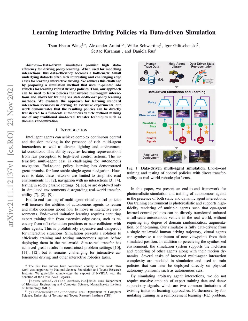 Data-driven simulators promise high data-efficiency for driving policy learning. When used for modelling interactions, this data-efficiency becomes a bottleneck: Small underlying datasets often lack interesting and challenging edge cases for learning interactive driving. We address this challenge by proposing a simulation method that uses in-painted ado vehicles for learning robust driving policies. Thus, our approach can be used to learn policies that involve multi-agent interactions and allows for training via state-of-the-art policy learning methods. We evaluate the approach for learning standard interaction scenarios in driving. In extensive experiments, our work demonstrates that the resulting policies can be directly transferred to a full-scale autonomous vehicle without making use of any traditional sim-to-real transfer techniques such as domain randomization.