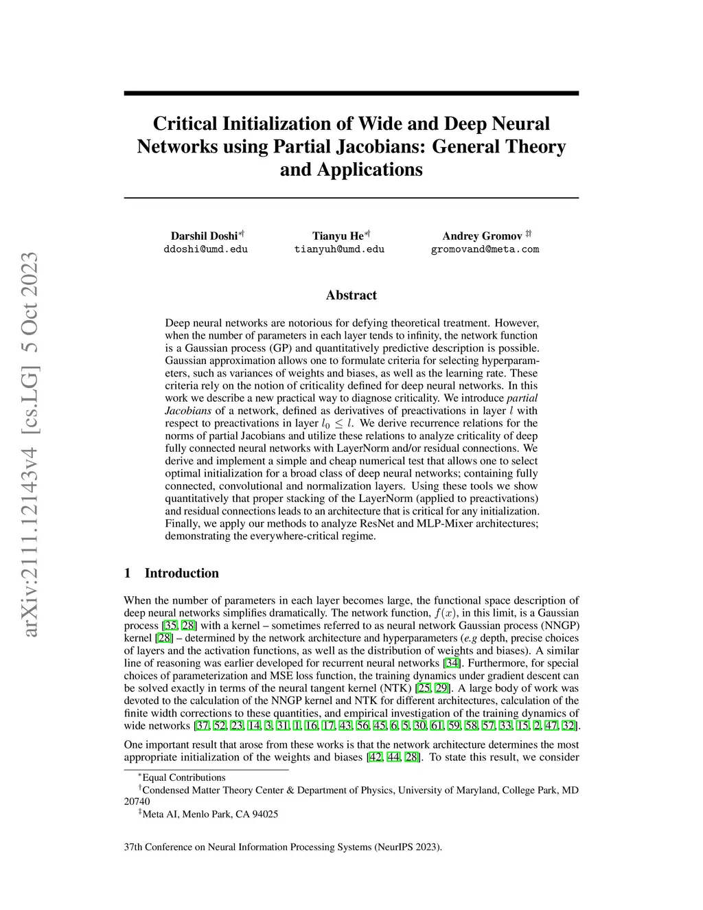 Deep neural networks are notorious for defying theoretical treatment. However, when the number of parameters in each layer tends to infinity, the network function is a Gaussian process (GP) and quantitatively predictive description is possible. Gaussian approximation allows one to formulate criteria for selecting hyperparameters, such as variances of weights and biases, as well as the learning rate. These criteria rely on the notion of criticality defined for deep neural networks. In this work we describe a new practical way to diagnose criticality. We introduce \emph{partial Jacobians} of a network, defined as derivatives of preactivations in layer with respect to preactivations in layer . We derive recurrence relations for the norms of partial Jacobians and utilize these relations to analyze criticality of deep fully connected neural networks with LayerNorm and/or residual connections. We derive and implement a simple and cheap numerical test that allows one to select optimal initialization for a broad class of deep neural networks; containing fully connected, convolutional and normalization layers. Using these tools we show quantitatively that proper stacking of the LayerNorm (applied to preactivations) and residual connections leads to an architecture that is critical for any initialization. Finally, we apply our methods to analyze ResNet and MLP-Mixer architectures; demonstrating the everywhere-critical regime.