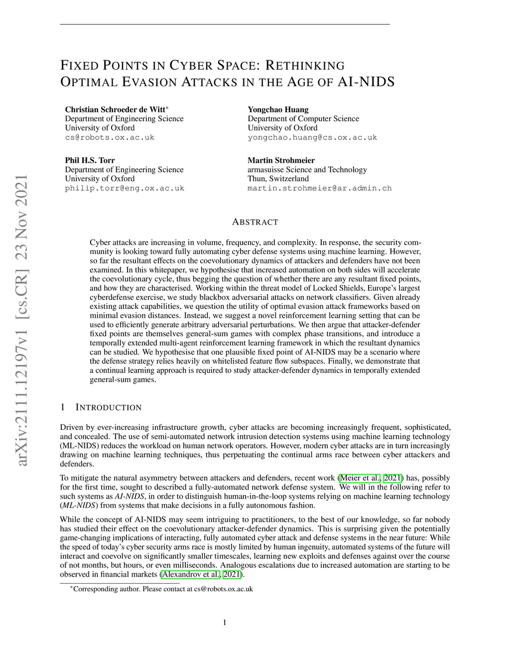 Cyber attacks are increasing in volume, frequency, and complexity. In response, the security community is looking toward fully automating cyber defense systems using machine learning. However, so far the resultant effects on the coevolutionary dynamics of attackers and defenders have not been examined. In this whitepaper, we hypothesise that increased automation on both sides will accelerate the coevolutionary cycle, thus begging the question of whether there are any resultant fixed points, and how they are characterised. Working within the threat model of Locked Shields, Europe's largest cyberdefense exercise, we study blackbox adversarial attacks on network classifiers. Given already existing attack capabilities, we question the utility of optimal evasion attack frameworks based on minimal evasion distances. Instead, we suggest a novel reinforcement learning setting that can be used to efficiently generate arbitrary adversarial perturbations. We then argue that attacker-defender fixed points are themselves general-sum games with complex phase transitions, and introduce a temporally extended multi-agent reinforcement learning framework in which the resultant dynamics can be studied. We hypothesise that one plausible fixed point of AI-NIDS may be a scenario where the defense strategy relies heavily on whitelisted feature flow subspaces. Finally, we demonstrate that a continual learning approach is required to study attacker-defender dynamics in temporally extended general-sum games.