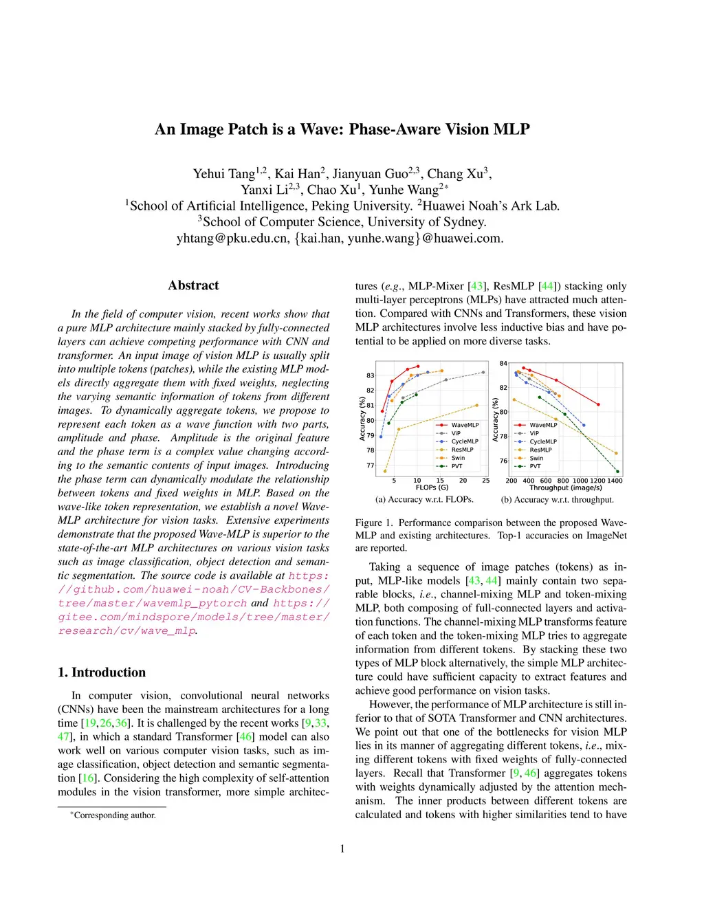 In the field of computer vision, recent works show that a pure MLP architecture mainly stacked by fully-connected layers can achieve competing performance with CNN and transformer. An input image of vision MLP is usually split into multiple tokens (patches), while the existing MLP models directly aggregate them with fixed weights, neglecting the varying semantic information of tokens from different images. To dynamically aggregate tokens, we propose to represent each token as a wave function with two parts, amplitude and phase. Amplitude is the original feature and the phase term is a complex value changing according to the semantic contents of input images. Introducing the phase term can dynamically modulate the relationship between tokens and fixed weights in MLP. Based on the wave-like token representation, we establish a novel Wave-MLP architecture for vision tasks. Extensive experiments demonstrate that the proposed Wave-MLP is superior to the state-of-the-art MLP architectures on various vision tasks such as image classification, object detection and semantic segmentation. The source code is available at https://github.com/huawei-noah/CV-Backbones/tree/master/wavemlp_pytorch and https://gitee.com/mindspore/models/tree/master/research/cv/wave_mlp.