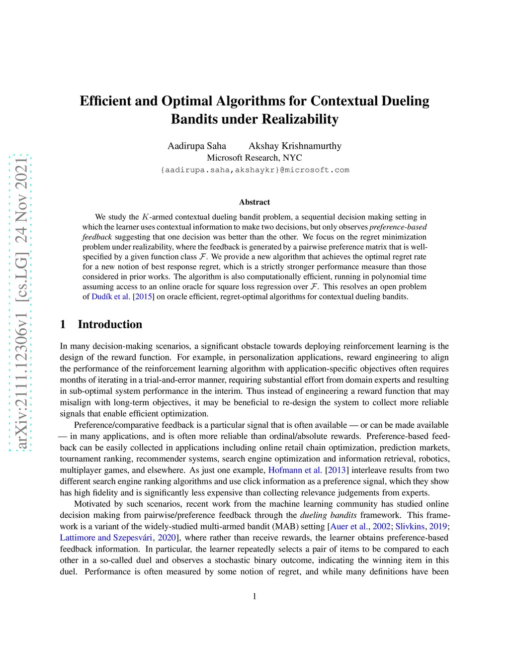 Efficient and Optimal Algorithms for Contextual Dueling Bandits under
