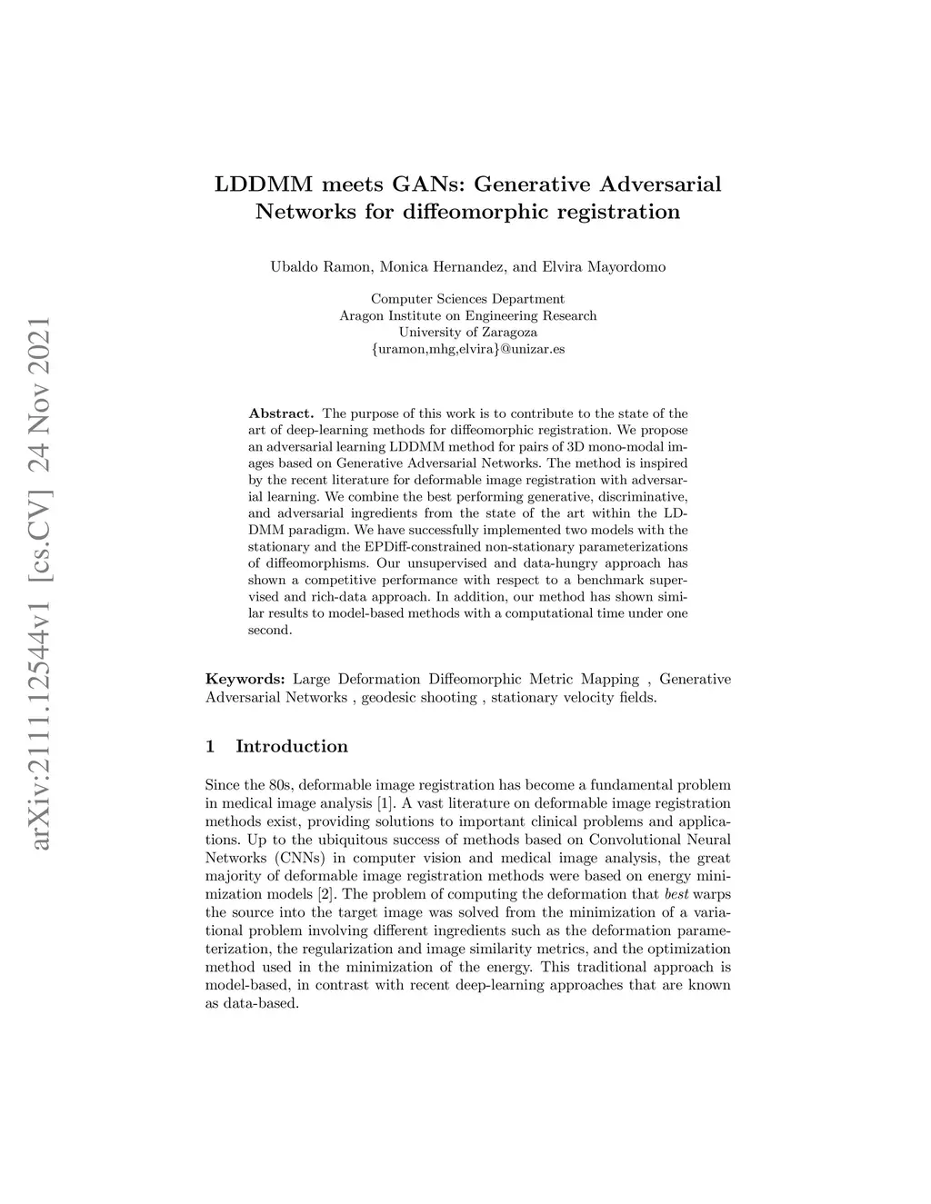 The purpose of this work is to contribute to the state of the art of deep-learning methods for diffeomorphic registration. We propose an adversarial learning LDDMM method for pairs of 3D mono-modal images based on Generative Adversarial Networks. The method is inspired by the recent literature for deformable image registration with adversarial learning. We combine the best performing generative, discriminative, and adversarial ingredients from the state of the art within the LDDMM paradigm. We have successfully implemented two models with the stationary and the EPDiff-constrained non-stationary parameterizations of diffeomorphisms. Our unsupervised and data-hungry approach has shown a competitive performance with respect to a benchmark supervised and rich-data approach. In addition, our method has shown similar results to model-based methods with a computational time under one second.
