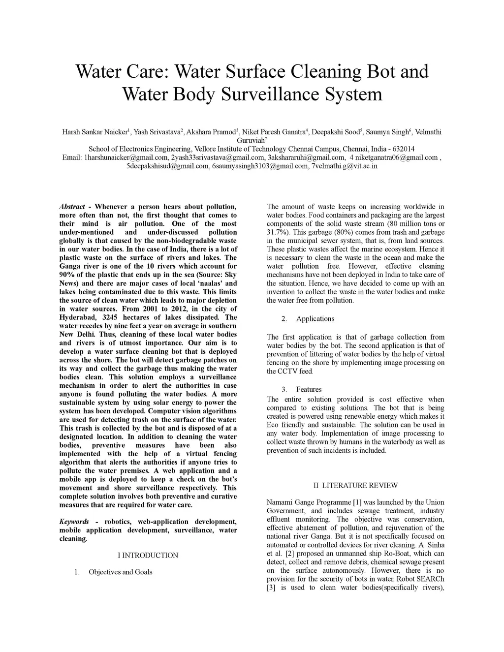 Whenever a person hears about pollution, more often than not, the first thought that comes to their mind is air pollution. One of the most under-mentioned and under-discussed pollution globally is that caused by the non-biodegradable waste in our water bodies. In the case of India, there is a lot of plastic waste on the surface of rivers and lakes. The Ganga river is one of the 10 rivers which account for 90 percent of the plastic that ends up in the sea and there are major cases of local nalaas and lakes being contaminated due to this waste. This limits the source of clean water which leads to major depletion in water sources. From 2001 to 2012, in the city of Hyderabad, 3245 hectares of lakes dissipated. The water recedes by nine feet a year on average in southern New Delhi. Thus, cleaning of these local water bodies and rivers is of utmost importance. Our aim is to develop a water surface cleaning bot that is deployed across the shore. The bot will detect garbage patches on its way and collect the garbage thus making the water bodies clean. This solution employs a surveillance mechanism in order to alert the authorities in case anyone is found polluting the water bodies. A more sustainable system by using solar energy to power the system has been developed. Computer vision algorithms are used for detecting trash on the surface of the water. This trash is collected by the bot and is disposed of at a designated location. In addition to cleaning the water bodies, preventive measures have been also implemented with the help of a virtual fencing algorithm that alerts the authorities if anyone tries to pollute the water premises. A web application and a mobile app is deployed to keep a check on the movement of the bot and shore surveillance respectively. This complete solution involves both preventive and curative measures that are required for water care.