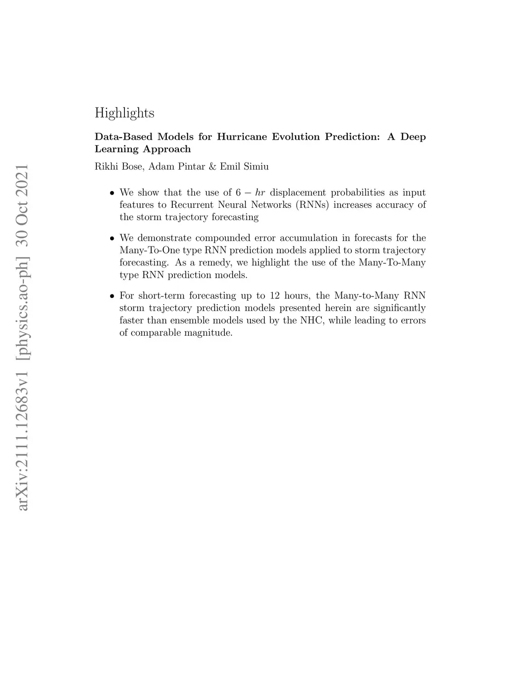 Data-Based Models for Hurricane Evolution Prediction: A Deep Learning